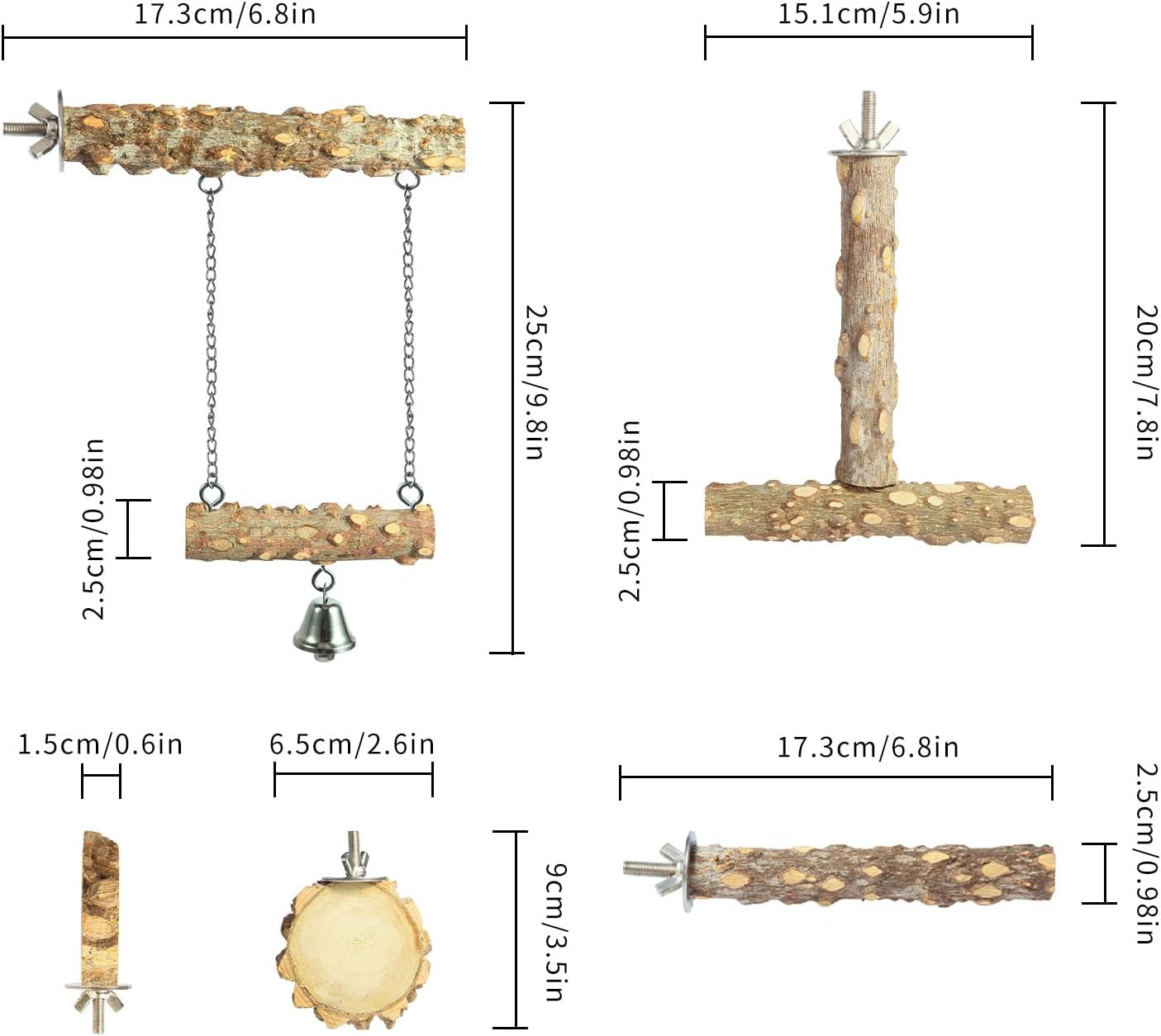 - Complete Set for Bird Enjoyment: Includes 1 Wooden Perch, 1 O-Shaped Platform, 1 Bird Swing, and 1 T-Shaped Perch. Offers a variety of perch types to simulate a natural habitat for your birds, promoting natural behaviors.