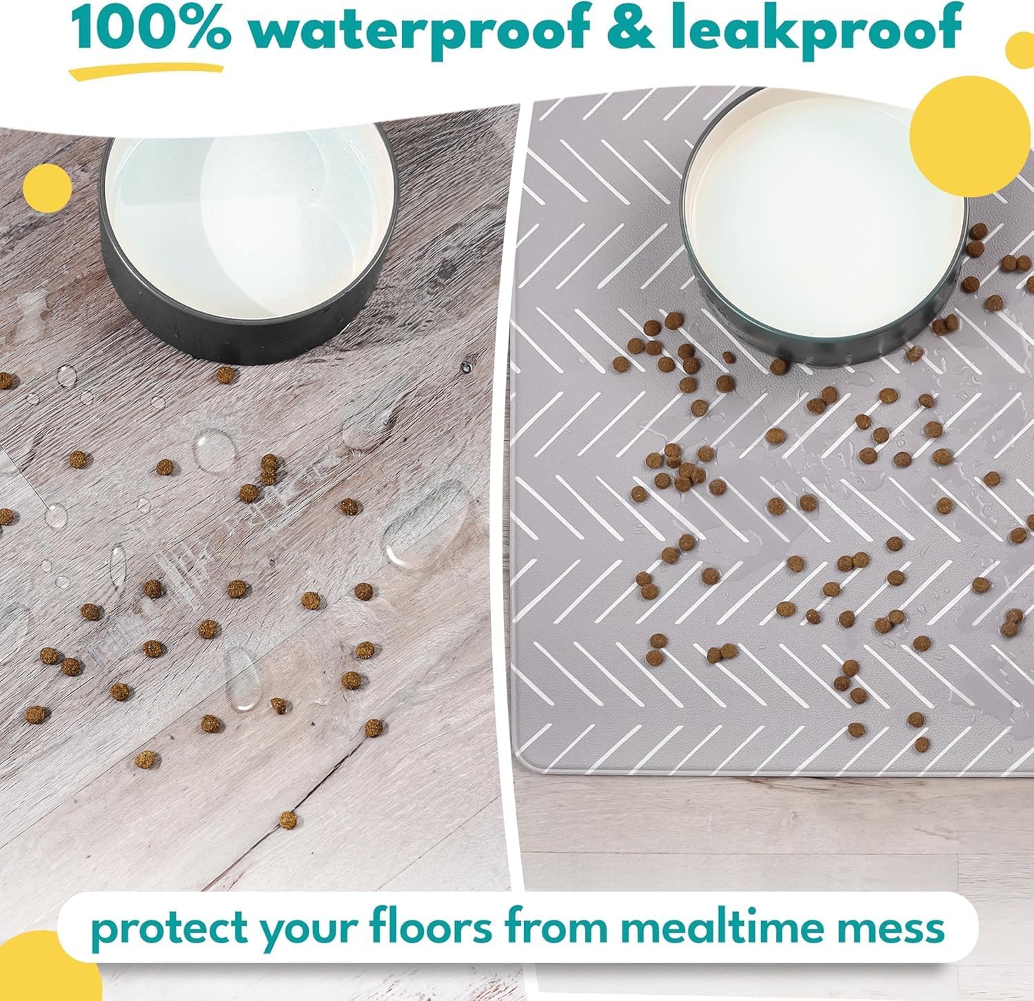 - WATERPROOF & EASY TO CLEAN β Unlike silicone dog food mats, our waterproof pet feeding mat resists pet hair, staying cleaner for longer. When messes happen, simply wipe down. Perfect for dog and cat bowls, this easy-to-clean mat keeps your pet's feeding area neat and hassle-free.