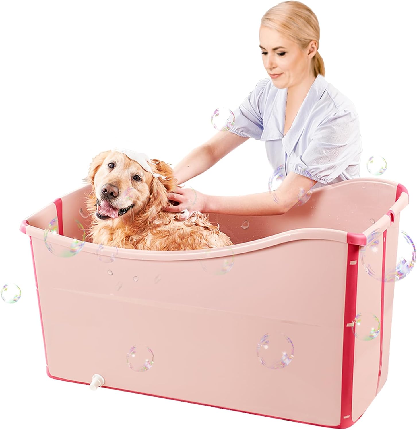 - 【Vet-Approved Safety & Unshakable Stability】 Engineered for anxious pets and worried pet parents! Our heavy-duty dog bathtub features 360° smooth rounded edges (no sharp burrs!) and 4.5mm reinforced walls that lock in warmth 30% longer* for a cozy, stress-free bath. The wide square base with non-slip texture grips floors securely, preventing slips or tip-overs even with wiggly 100+ lb dogs.