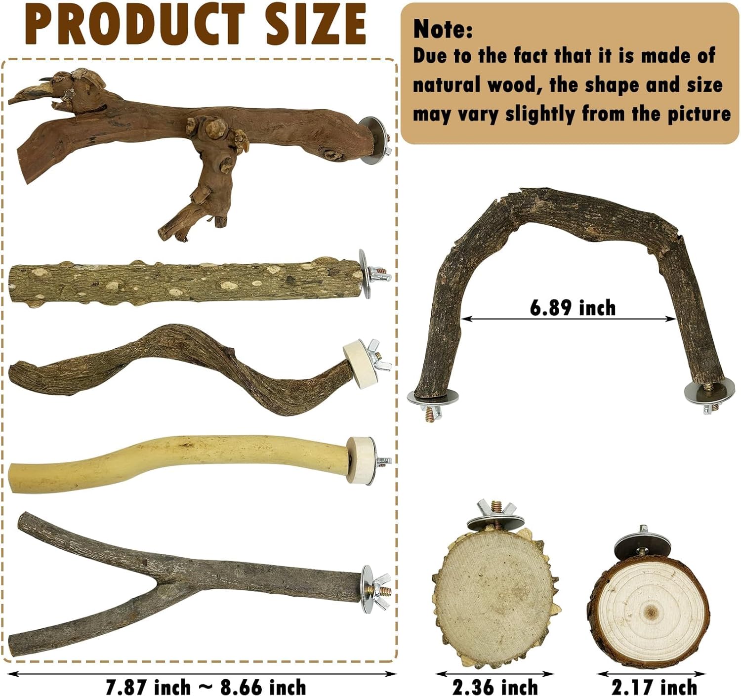 - Different Kinds of Bird Perches: Our natural bird wooden stand includes 8 different types of perches, 1 x forked branch bird perch,1 x U-Shaped bird perch, 2 x round platforms, and 4 x regular parrot perches.We provide the parts and various types of perches needed to assemble this bird perch stand to simulate a natural habitat for your birds and promote their natural behavior
