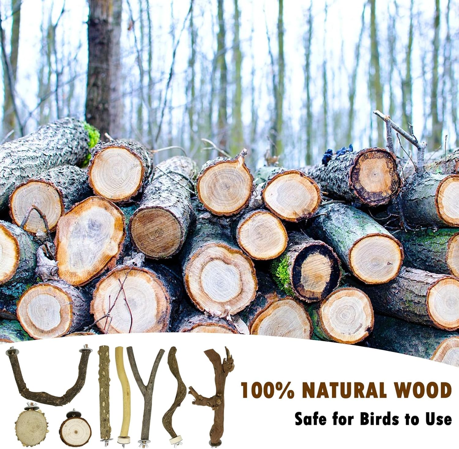 - Natural Wood Material: The birds stand branches in this set are made from 100% natural grapewood that are durable, paint-free and odor-free to provide a safe, natural place for your feathered friends to stand. Each parrot cage perch has an unsanded, rough-textured surface that allows the bird's feet to easily grip the perch, helping to avoid slips and falls, exercising the feet and sharpening their claws