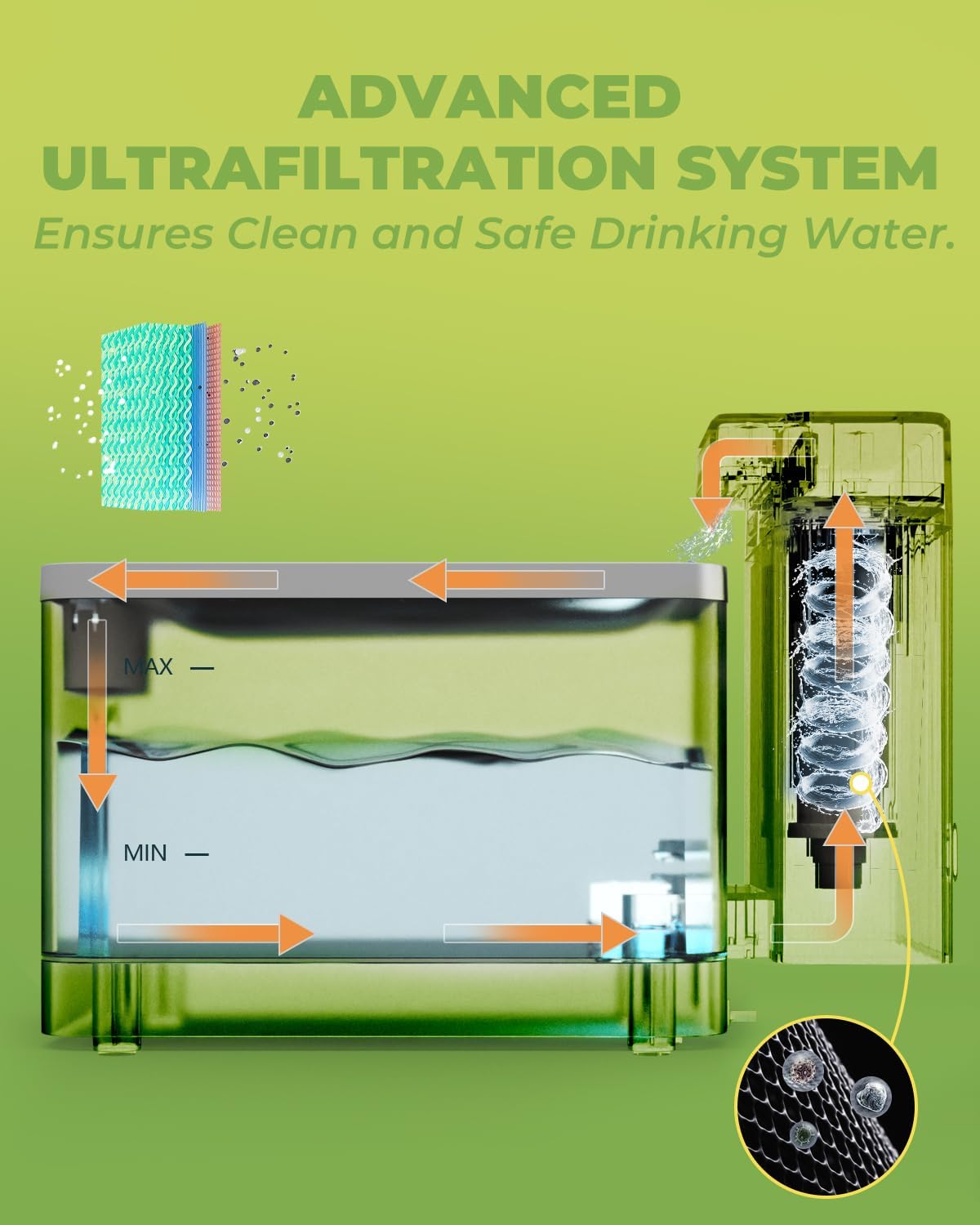- ULTRAFILTRATION SYSTEM: Ensures real clean drinking water by filtering out impurities, particles, and odors more than 0.01 microns, promoting your pet's health