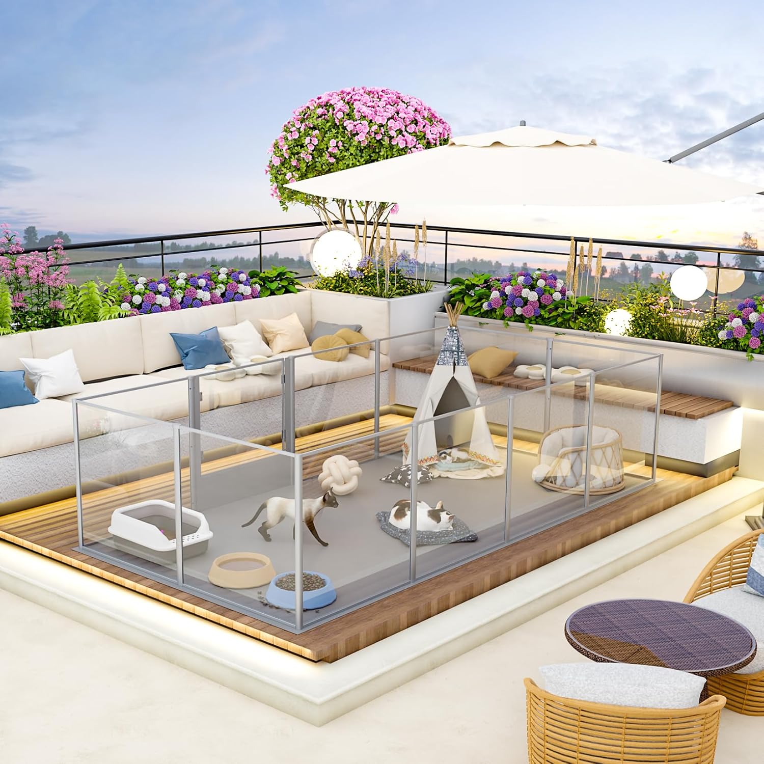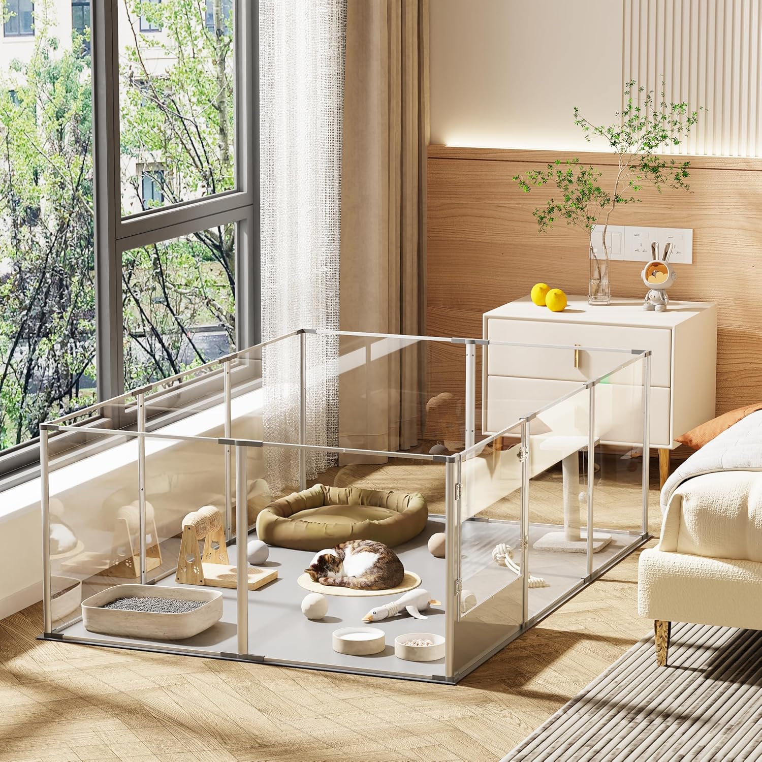 - Clear Acrylic Fence Design - Crystal-clear acrylic dog fence playpen enables you can interact with your pets closely, 360Β°high transparency and wide vision, itβll relieve your pets from anxiety, they also make sure you are by their side, equipped with a door for dog mom/ pets to come and go easily, so this is a unique gift for your loved friends, get this fence in the room, instantly upgrade your home space