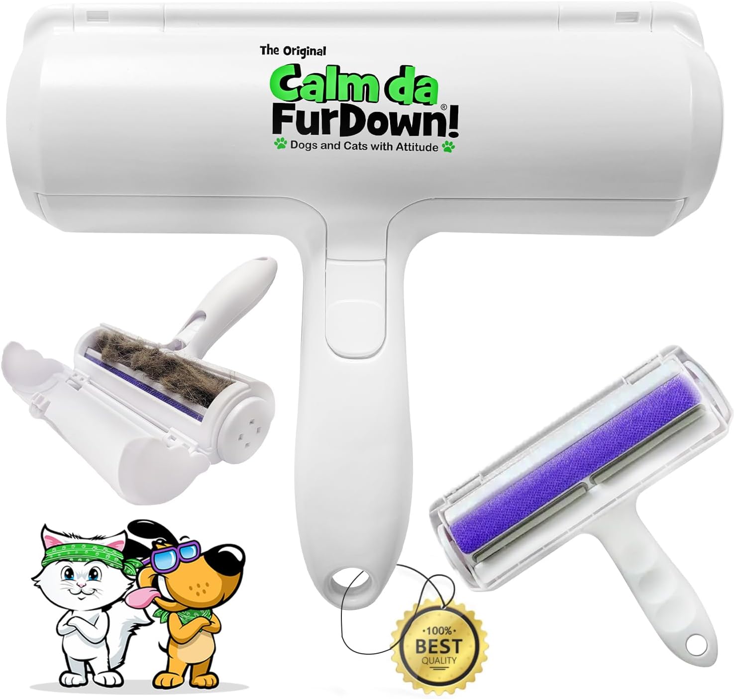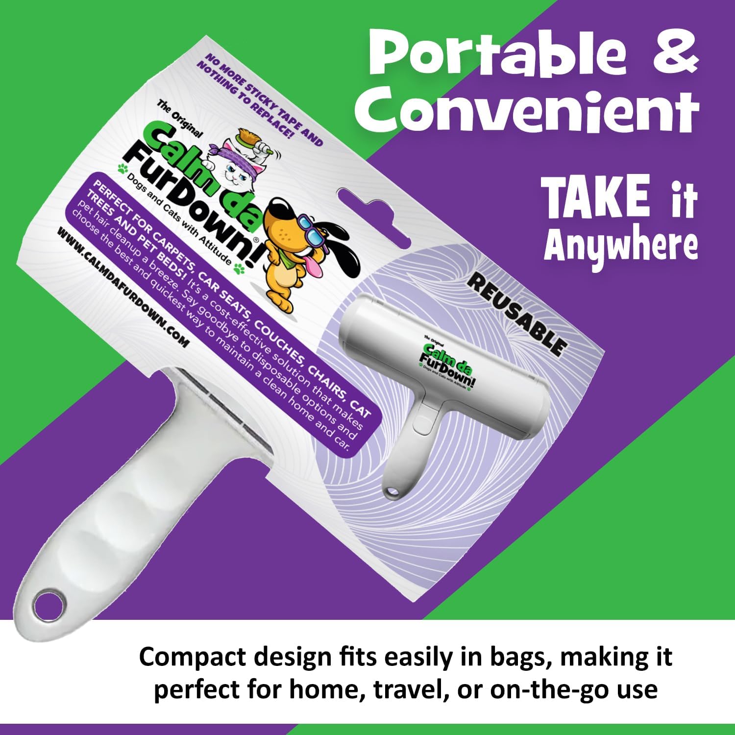 - PORTABLE FUR REMOVAL TOOL: This reusable lint roller offers a convenient solution for pet fur removal. Whether you're at home or traveling, it effectively cleans fur from couches, chairs, bedding, dog beds, cat trees, furniture, and car seats. Our easy to use, the Calm Da Fur Down pet hair roller ensures a clean environment without the need for sticky sheets or batteries.