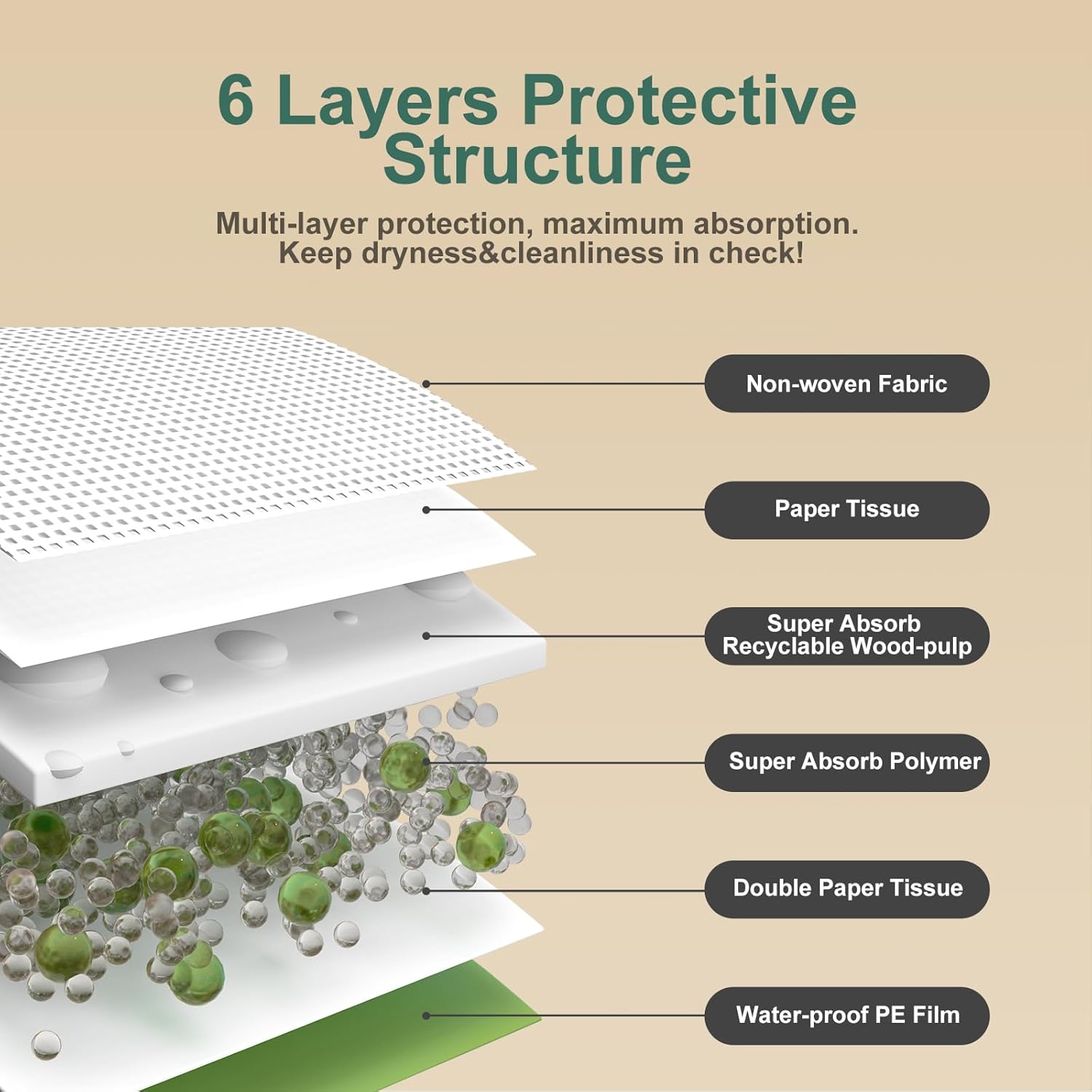 - γLeakage ProtectionγOur disposable pet training pads feature a 6-layer absorbent design, enhanced with high-polymer materials that quickly absorb urine, preventing odor spread. The PE bottom film provides exceptional leak-proofing, ensuring that urine doesn't seep through to floors or carpets, which will preserve the cleanliness of your home environment.
