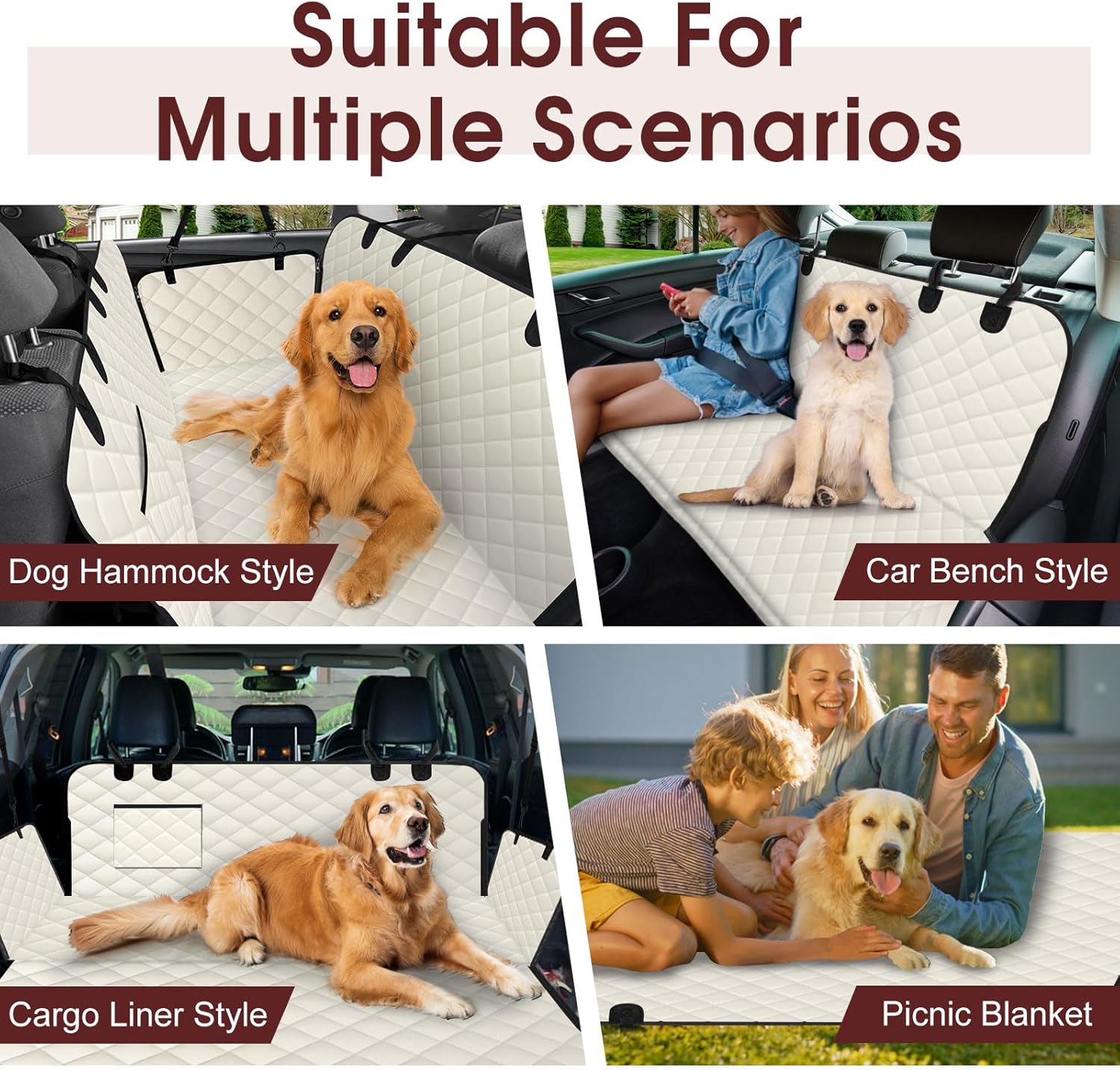 - γMulti Functional UseγThe pet car seat cover is not only designed as a dog hammock with side wings. It can also be transformed into a car bench style or a cargo liner style. When this dog hammock for cars is fully unfolded, it can become a camping mat, allowing your family, friends, and pets to enjoy picnics together. Bring this multifunctional back seat pet cover and start your journey.