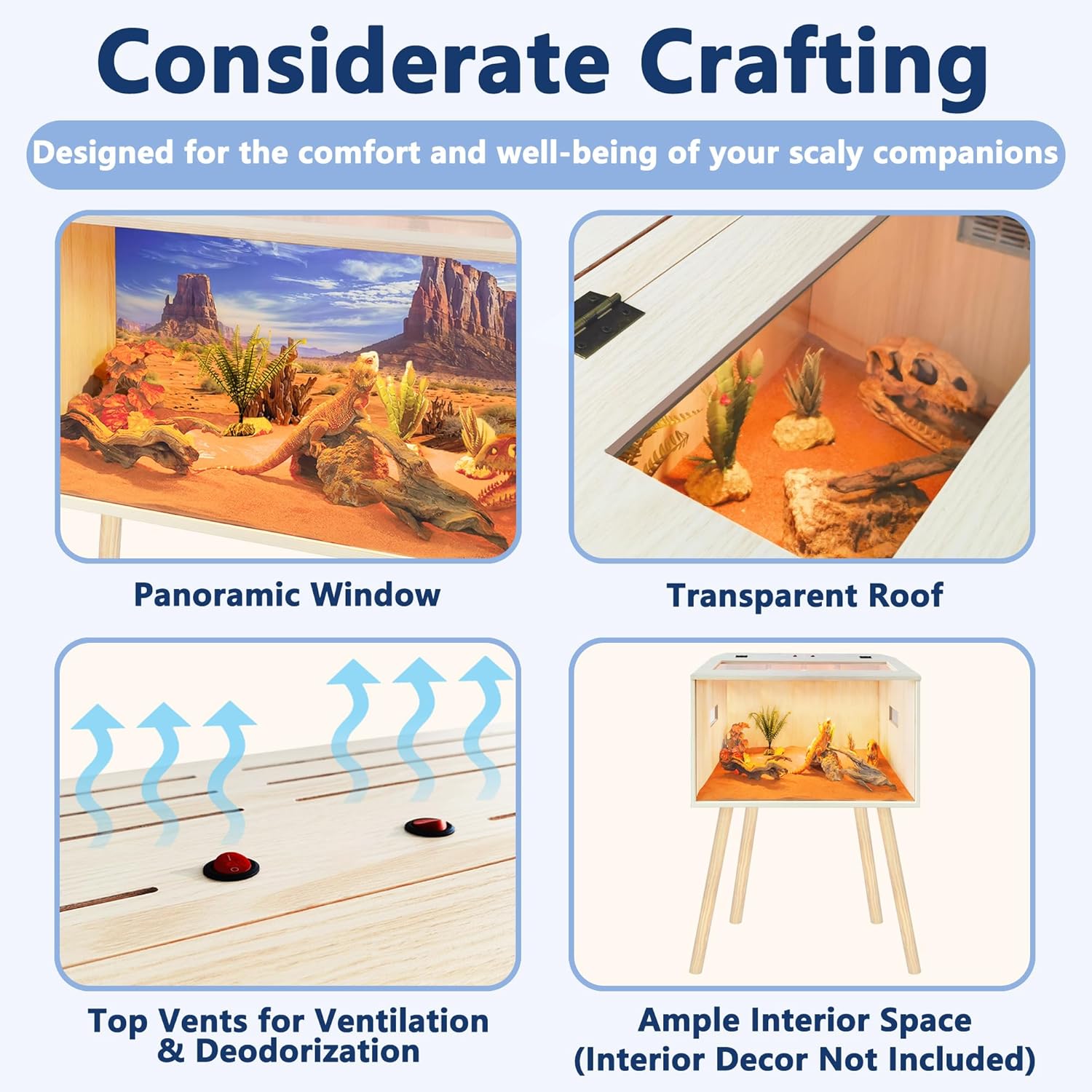 - 【Comfortable Habitat】Provide your reptiles with a spacious, secure, and comfortable home. This enclosure features a front acrylic panel for ultra-clear visibility, allowing you to observe your pets in their natural environment. Equipped with top and side ventilation, it ensures excellent airflow to keep your reptiles healthy. This wood habitat also represents greater heat retention than normal glass and mesh tank, which is good for your pets like lizard, gecko and snakes! Important Note: This habitat is not designed to hold water.