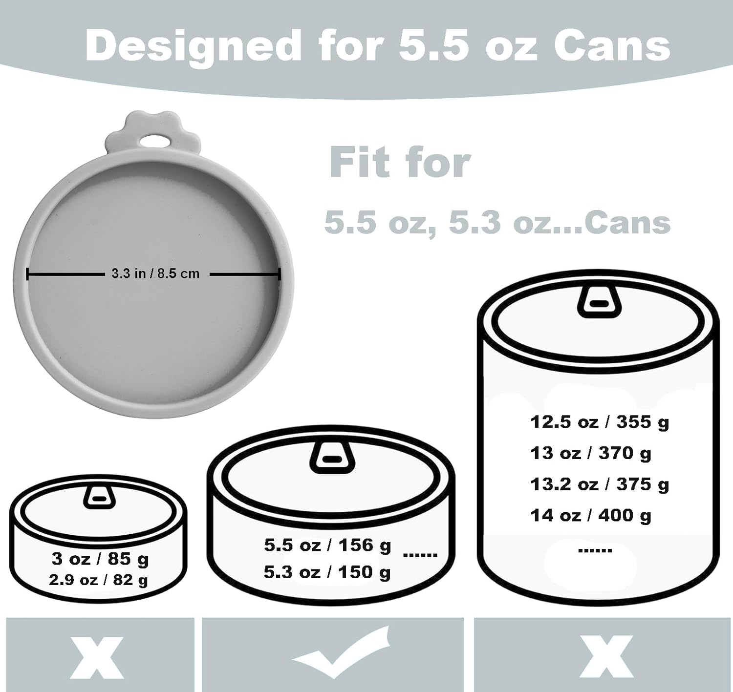 - The cat can lid inner diameter size is 3.3"/8.5cm, fiting cat food cans 5.5 oz 5.3 oz...
