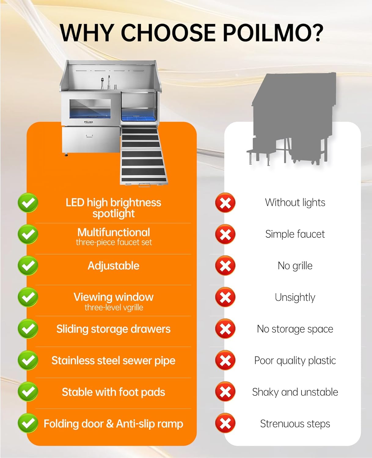 - Innovative and Practical Design: The POLIMO dog grooming station features multiple outstanding design elements: β IP65 Waterproof high-brightness LED spotlight. β‘ Grade A tempered glass observation window. β’ The bathtubβs side panels feature a curved slide design, making it easier to operateβ£ Two-piece floor grid, adjustable to three different heights. β€ Sliding storage drawer for organized storage. β₯ Multi-function faucet and showerhead, adjustable to left, center, or right positions.β¦ Two drainage options are available: one with a pet hair catcher and another stainless steel drain pipe featuring an odor-blocking S-trap design