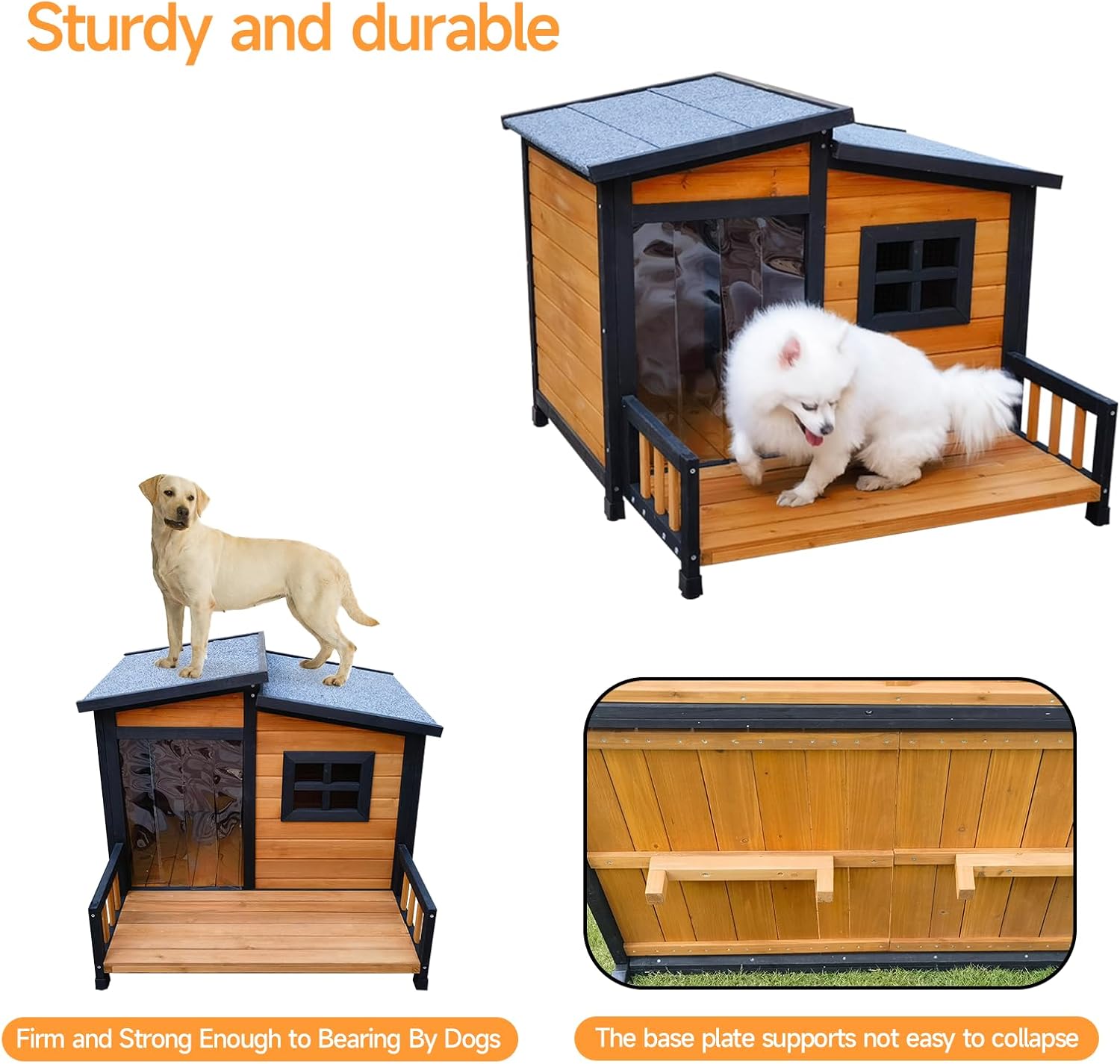 - Withstand Bad WeatherοΌThe outdoor dog house consists of a strong & sturdy pine construction. PVC curtain away from wind and rain. Heavy-duty mineral roofing felt and a weatherproof sealer provide ultimate protection for long-term outdoor use.Anticorrosive plastic feet can survive harsh outdoor conditions while preventing scratches on indoor floors.