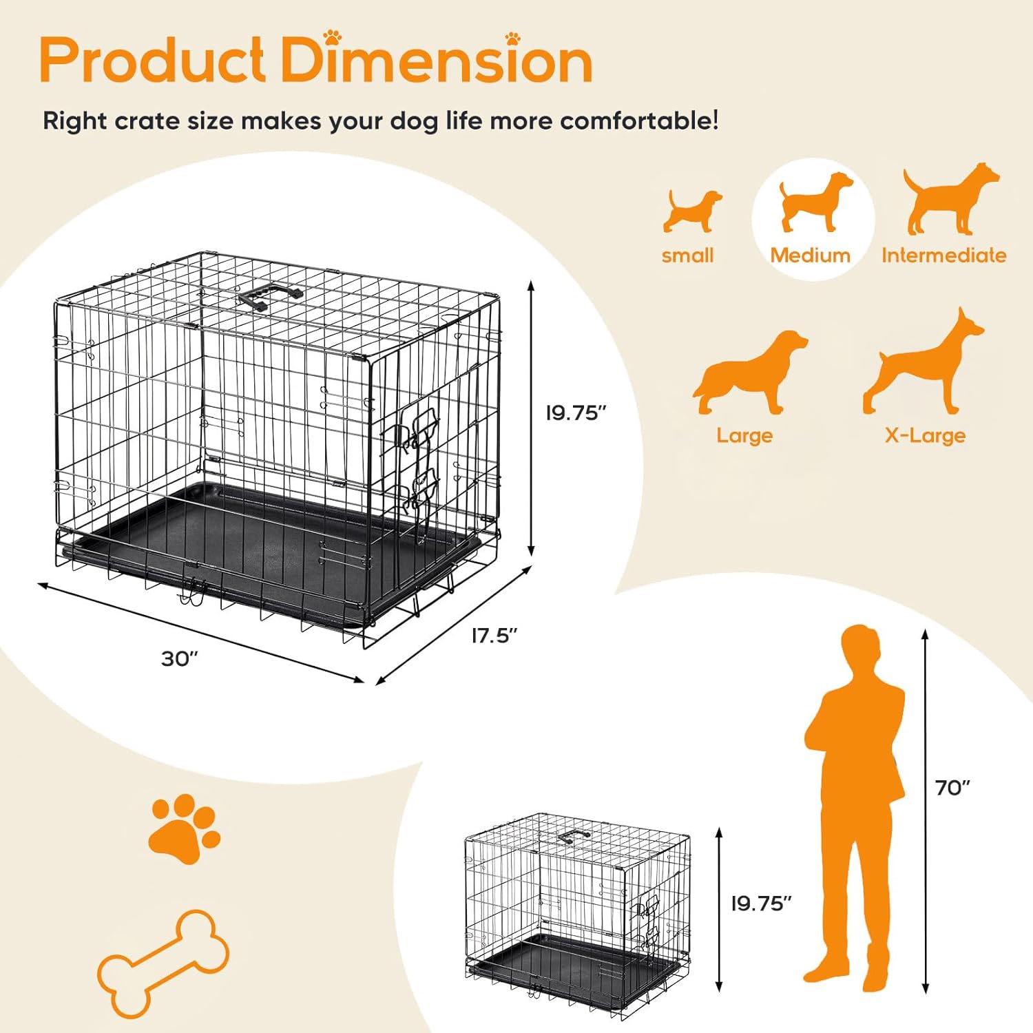 Dog Crate, 30 Inch Medium Wire Kennel with Divider Panel, Metal Cages with Double Door, Leak-Proof Pan Tray, Folding Portable for Indoor Outdoor Travel