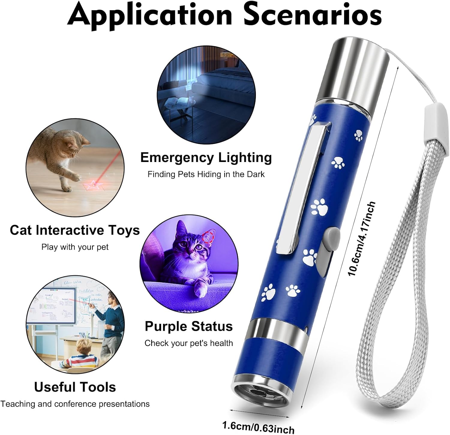 - Multi-scenario application: The red mode is great for interactive play with your pet, the purple mode can be used for detecting counterfeit bills and pet health checks, and the white mode is great for emergency lighting at night. Whether it's for home use, outdoor activities, classroom teaching, or while traveling, this cat toys are easy to use