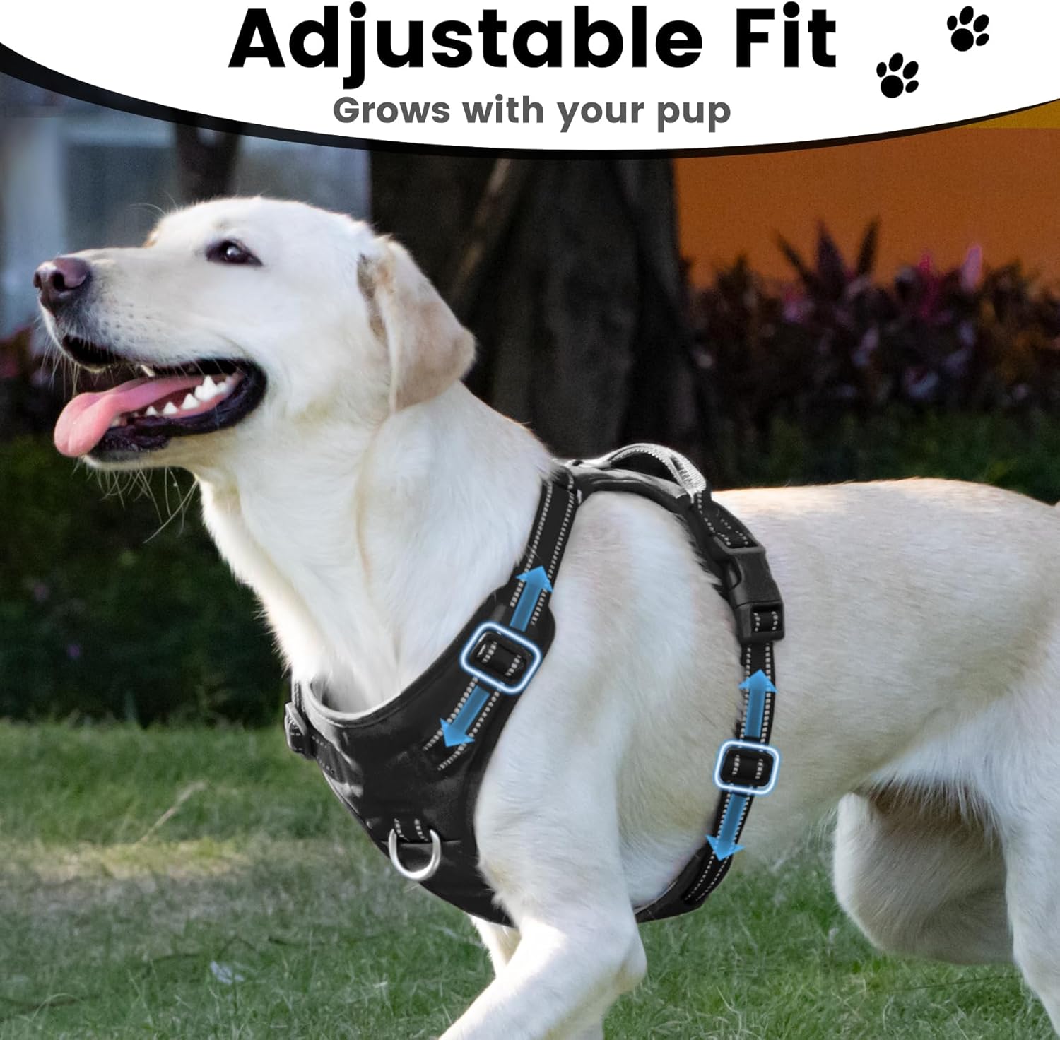 - Easy Adjustment for Perfect Fit: This harness offers 3-way adjustable points, allowing for a precise fit that accommodates various dog sizes and shapes. Quickly and effortlessly adjust for your dog with much room of growth. Achieve the ideal comfort and security with minimal effort.