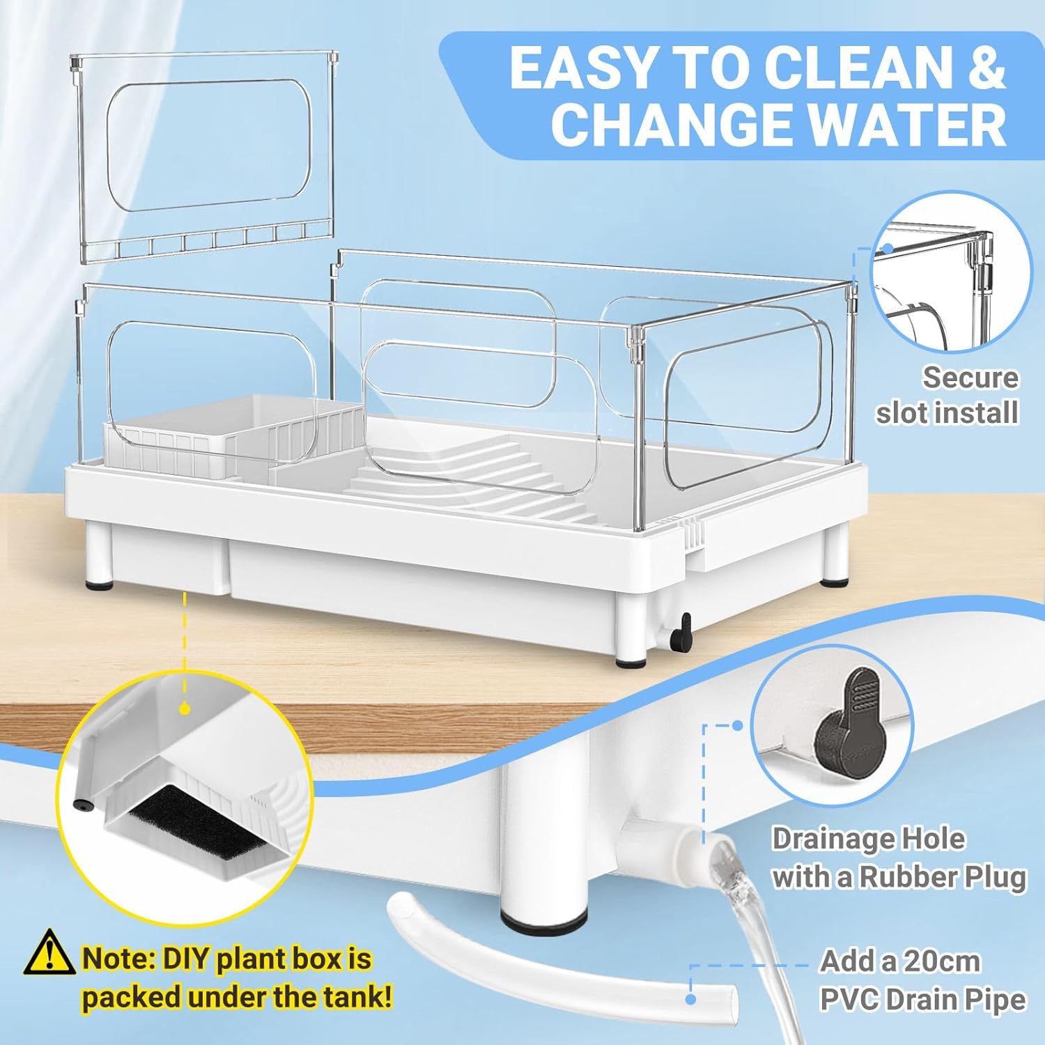 - 【EASY TO USE AND CLEAN】Keep your turtle tank clean and hassle-free with bottom drainage feature. Simply drain the water, remove debris, and refill for a healthier habitat. There is a DIY plant box is packed under the tank, you can use our included colored stones and trees to decor the landscape of the turtle aquarium.