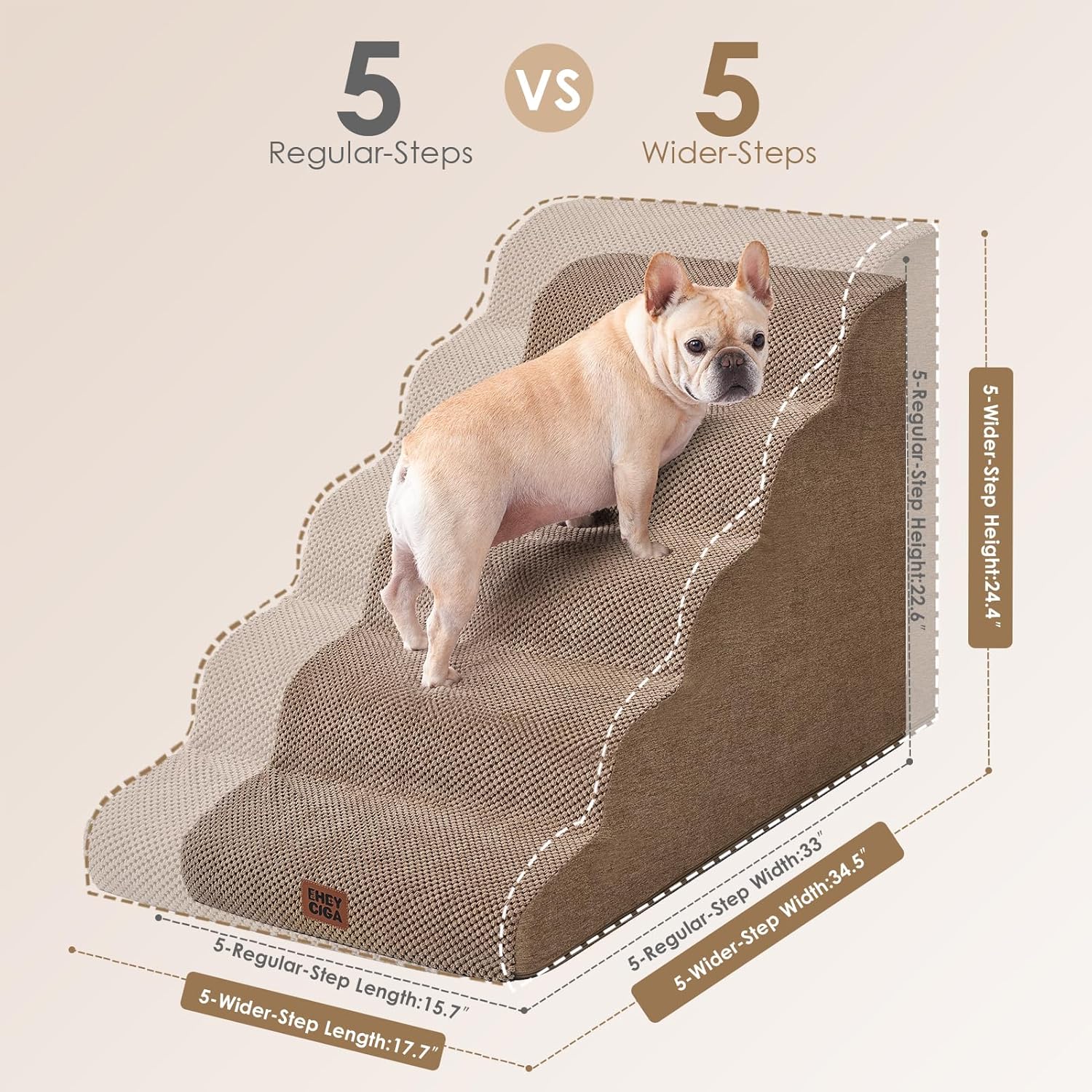 - MULTIPLE STEP SIZES - This dog stair has 2 steps, 3 steps, 4 steps and 5 steps to choose. Our 2-step stairs fits for chair/sofa/bed up to 13inch. 3-step stairs fits for chair/sofa/bed up to 17inch. 4-step stairs fits for chair/sofa/bed up to 21inch. And 5-step stairs fits for chair/sofa/bed up to 24inch.