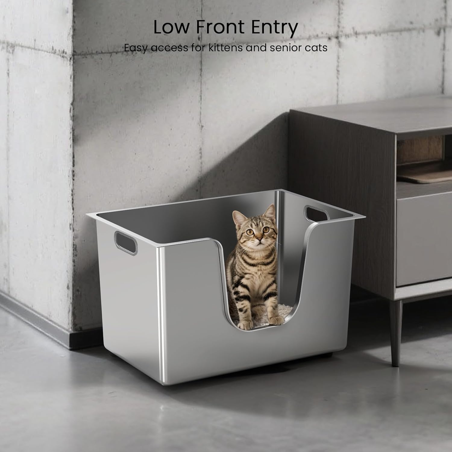 - Odor-Free & Easy to Clean: Crafted from high-quality stainless steel, this open cat litter box won't absorb odors. Durable metal material resists dents, scratches, and abrasions, ensuring long life and easy cleaning. Unlike plastic trays, a stainless litter box is rust-proof and non-stick, helping to maintain a fresh, sanitary environment for you and your pet.