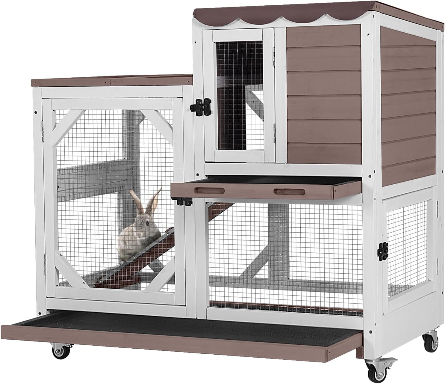 GUTINNEEN Rabbit Hutch Indoor Outdoor 2 Story Bunny House on Wheels Wood Rabbit Cage with 2 Pull Out Trays Guinea Pig Cage