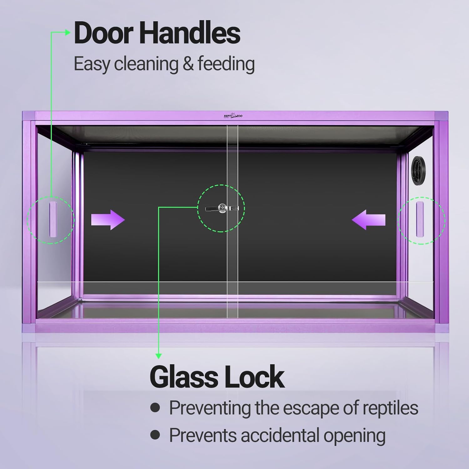 - Secure & Accessible Front Opening: Equipped with dual sliding doors on the front, this glass cage features a metal lock for added security. This design not only makes it convenient for daily feeding and maintenance but also effectively prevents your reptiles from escaping and protects curious children from accidentally opening the doors.