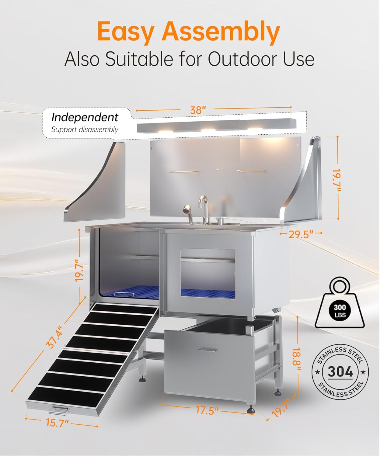 - Innovative and Practical Design: The POLIMO dog grooming station features multiple outstanding design elements: β IP65 Waterproof high-brightness LED spotlight. β‘ Grade A tempered glass observation window. β’ The bathtubβs side panels feature a curved slide design, making it easier to operateβ£ Two-piece floor grid, adjustable to three different heights. β€ Sliding storage drawer for organized storage. β₯ Multi-function faucet and showerhead, adjustable to left, center, or right positions.β¦ Two drainage options are available: one with a pet hair catcher and another stainless steel drain pipe featuring an odor-blocking S-trap design