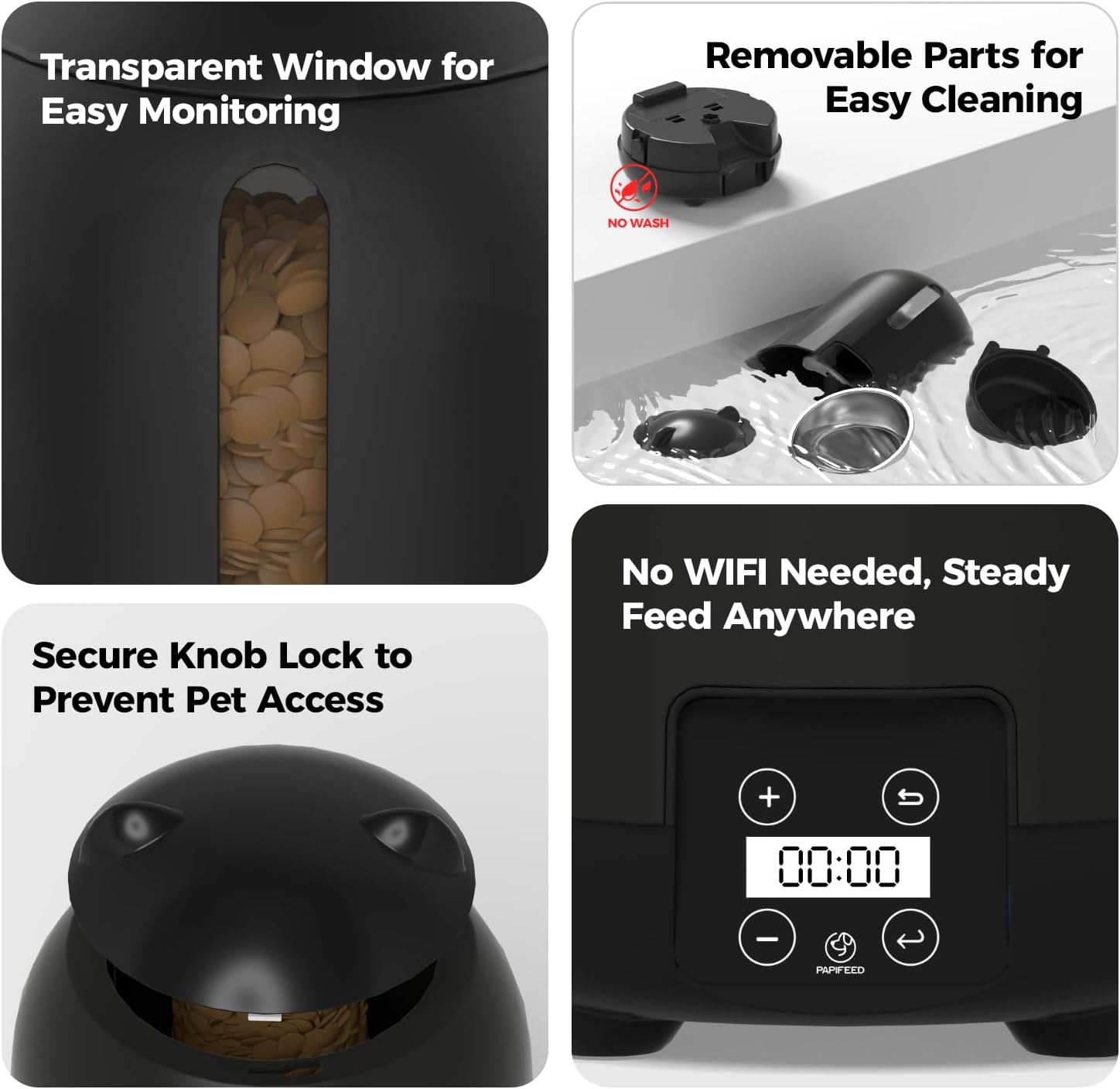 - 【SEALED MOISTURE-PROOF DESIGN TO KEEP CAT FOOD FRESH】The PAPIFEED cat feeder automatic not only has a built-in desiccant box + sealed grain bin, which effectively isolates moisture and prevents cat food from getting damp and spoiling. It also uses a knob-type bin cover design that needs to be manually rotated to open to prevent pets from scratching and stealing food, thus protecting food safety. From the first feeding to the last meal, it ensures that every grain of food eaten by your pet remains crispy.