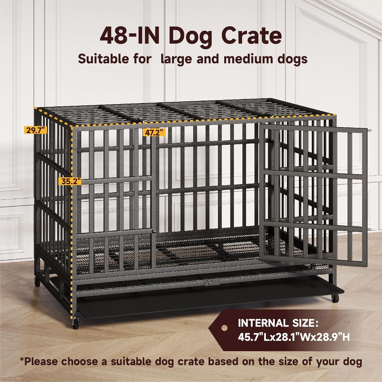 48 Inch Heavy Duty Indestructible Dog Crate Steel Escape Proof, High Anxiety Cage, Kennel with Wheels, Removable Tray, Extra Large XL XXL