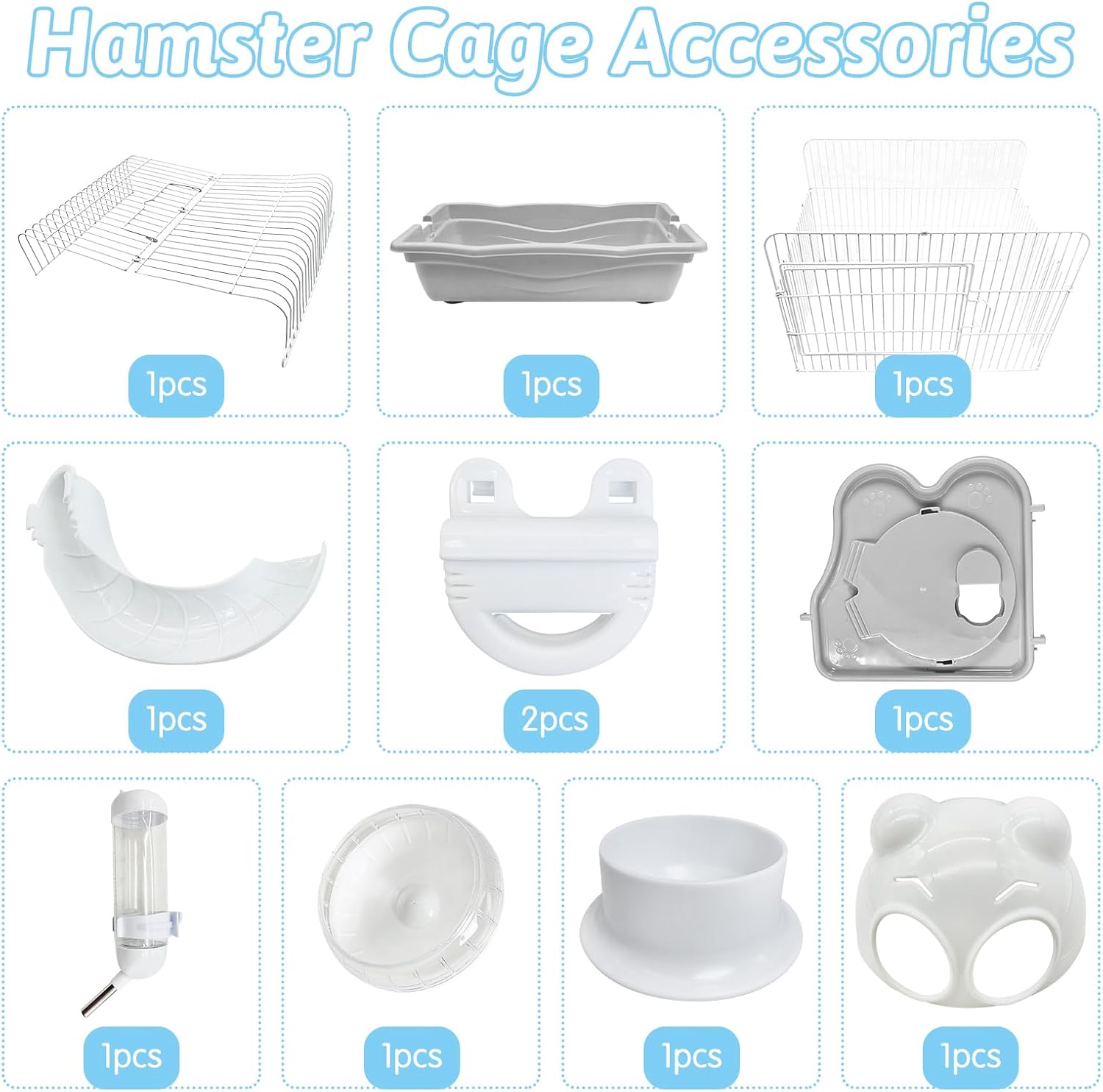 - Hamster cage: Set includes mice cage*1, castle house*1, 2nd floor platform*1, slide*1, running wheel*1, water bottle*1, food bowl*1. The hamster cage has a sturdy structure, which allows you to ventilate the cage and see your pet's activities