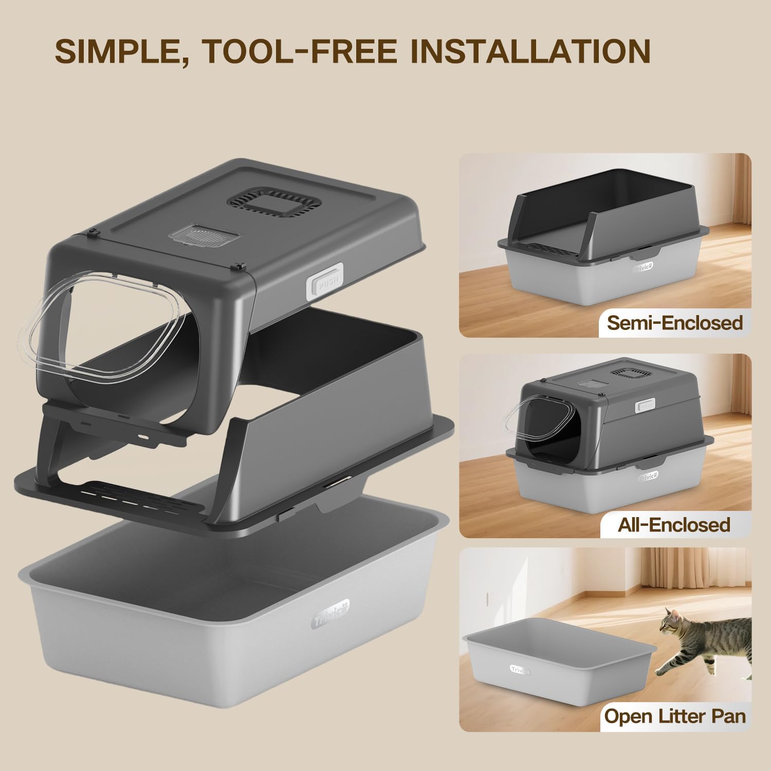 - Easy to Assemble & Clean – Includes All Accessories This kitty litter box comes with everything you need, including a charcoal filter, litter mat, Litter Trap Step and all necessary fasteners. Simple installation takes just minutes, and the smooth stainless steel base resists sticking and residue. Less time cleaning, more time playing with your pet.