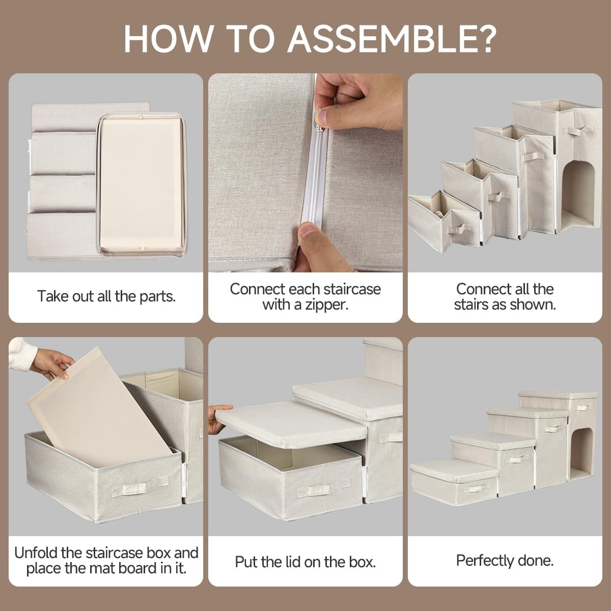 - Easy to Assemble: First, you need to attach the zipper of each step, then open each step completely, put each support board into the corresponding storage box, and finally close the lid. When not needed, remove the lid and fold it completely so you can easily move, transfer and store it. This saves space and is suitable for small rooms