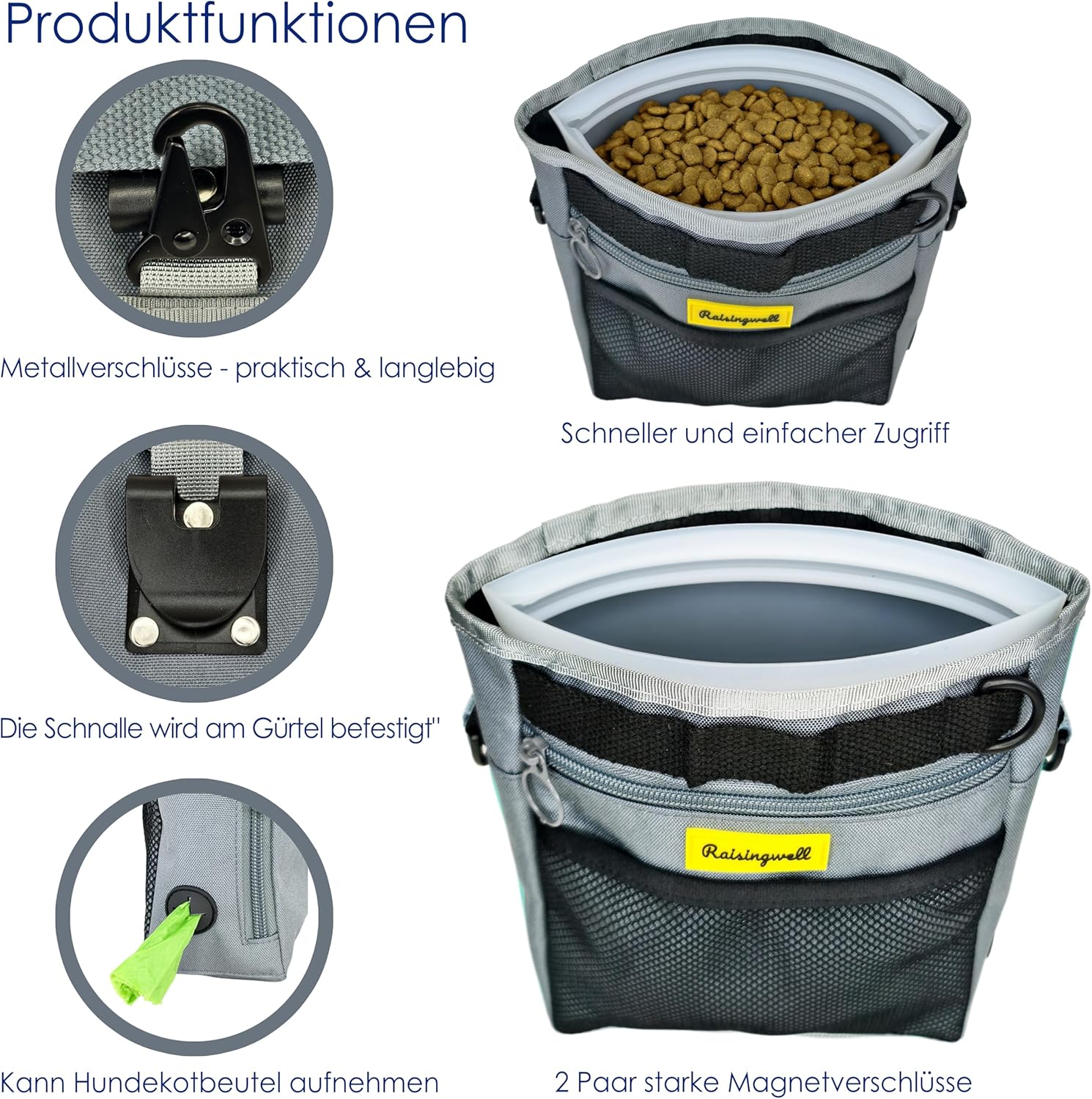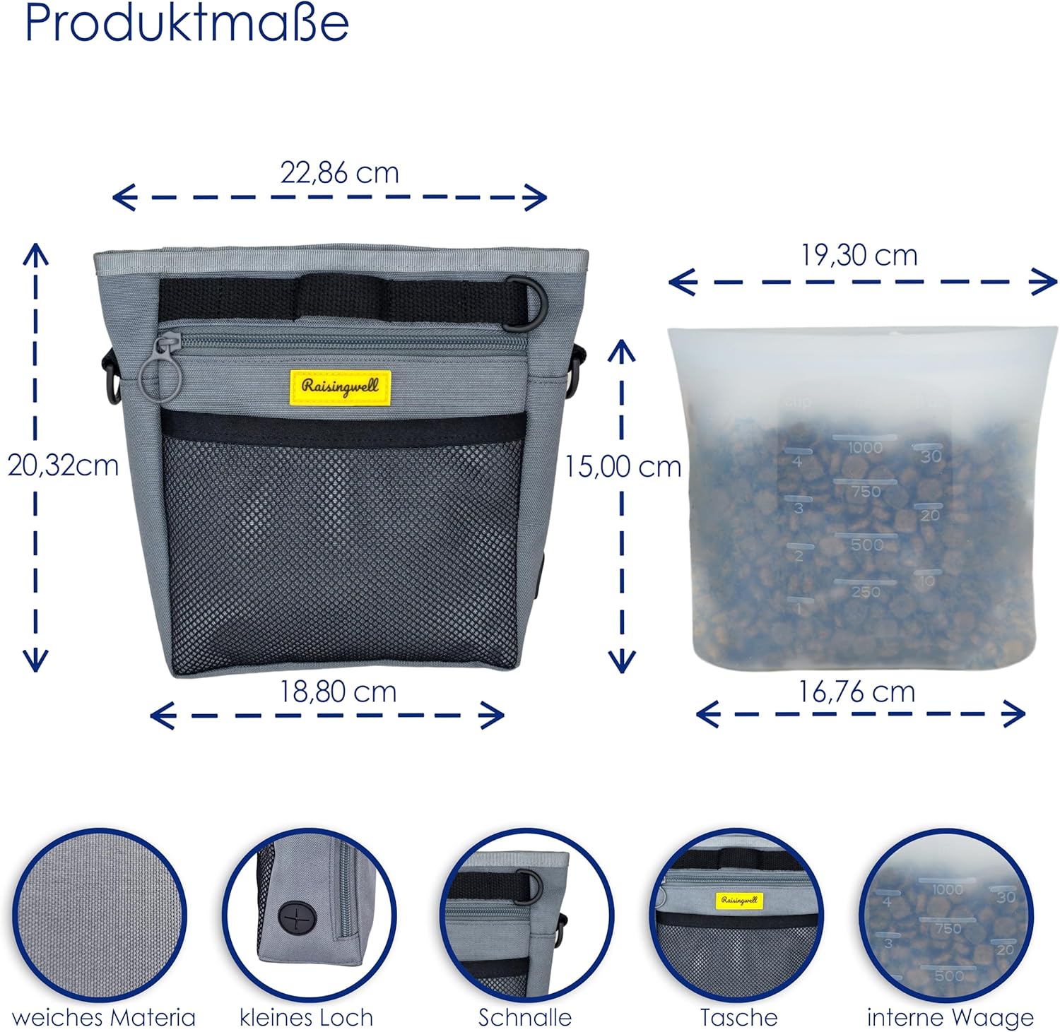 - 5.Durable Tech Material: Raisingwell's dog treat training pouch is made from durable, washable, and non-toxic fabric. Notably, its waterproof lining solves the problem of difficult-to-clean interiors of training bags, making it a great choice for your dog treat bag or dog treat fanny pack.