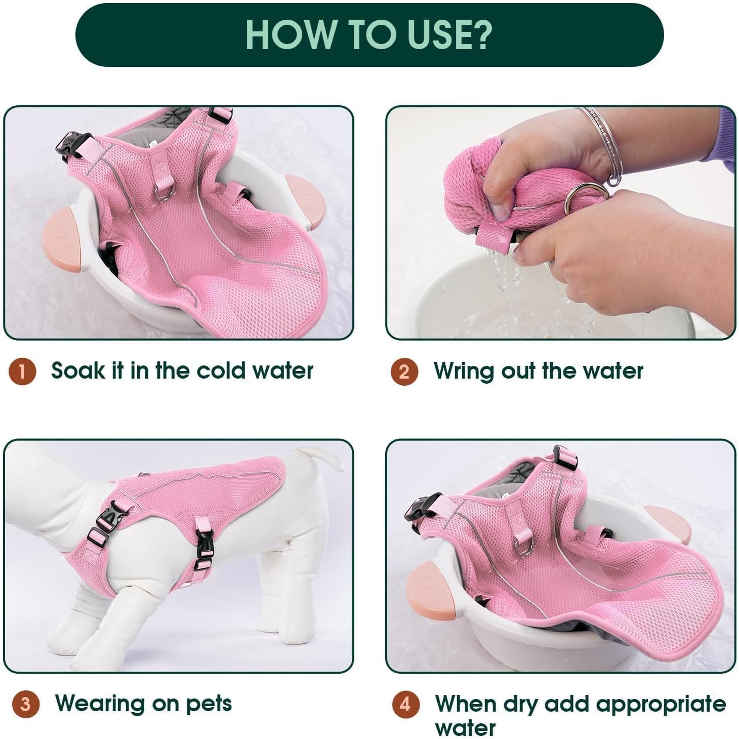 - HOW TO USE: Simply soak the cooling undershirt in cold water, wring it out and put it on your dog. As the vest gradually evaporates, it lowers your dog's body temperature and provides a soothing cooling effect. By using this cooling vest, you can greatly reduce your dog's risk of elevated temperatures and heat-related problems