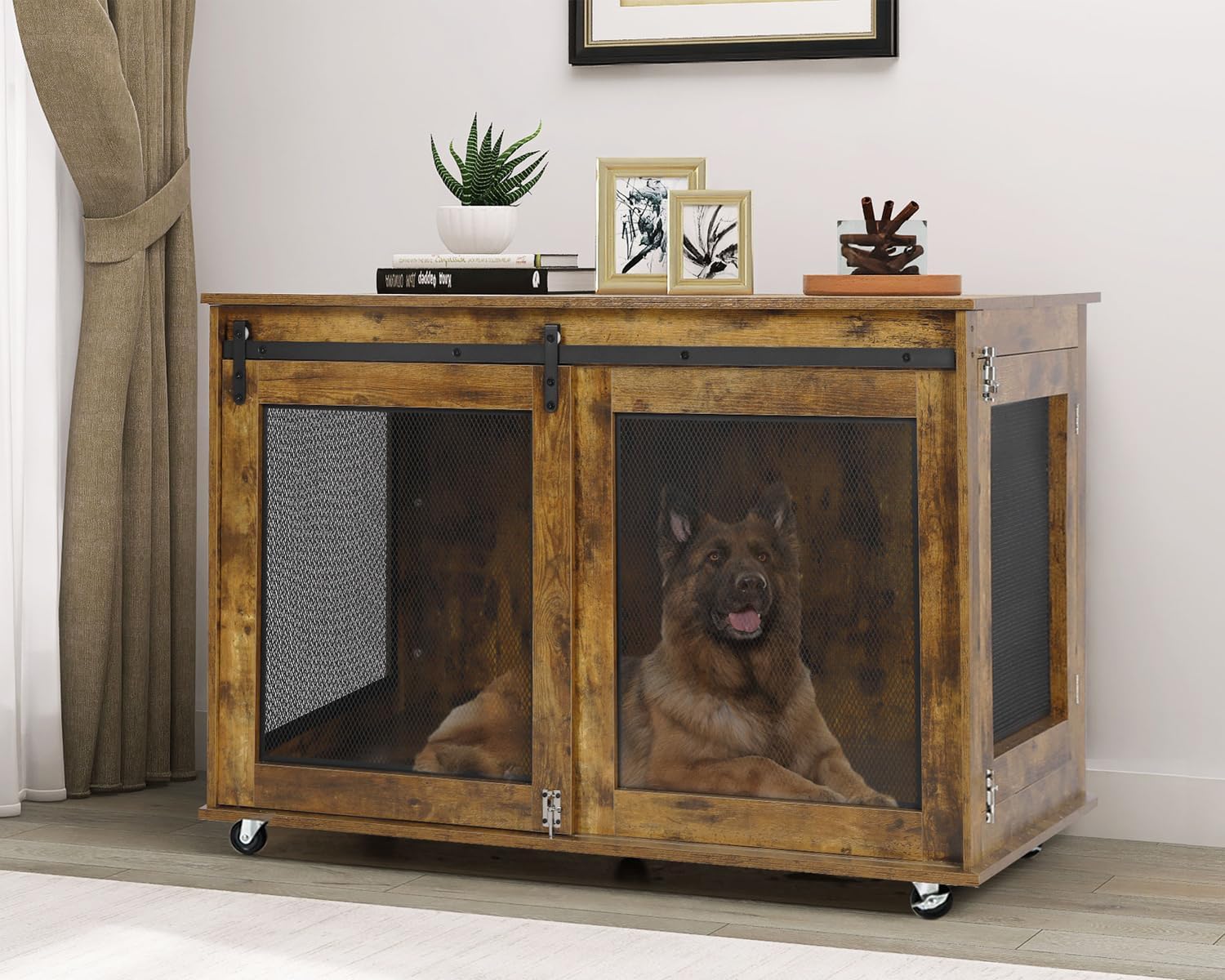 LINLUX 47 Inch Large Dog Crate Furniture, Wooden Heavy Duty XL Dog Kennel Indoor, Decorative Dog Cage Table for Large Dogs, with Sliding Doors, Wheels and Flip-top Plate, Rustic Brown