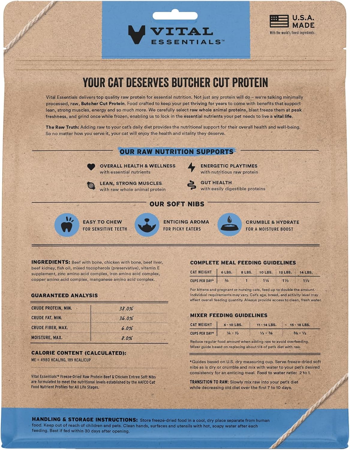 - SOFT NIBS FREEZE-DRIED RAW BEEF & CHICKEN CAT FOOD: Vital Essentials Freeze Dried Cat Food packs more protein than industry standard into every soft bite to deliver the peak vitality your cat deserves, especially when compared to dehydrated cat food. Our complete and balanced freeze-dried raw cat food is made with Butcher Cut premium beef and chicken, responsibly sourced in the USA.