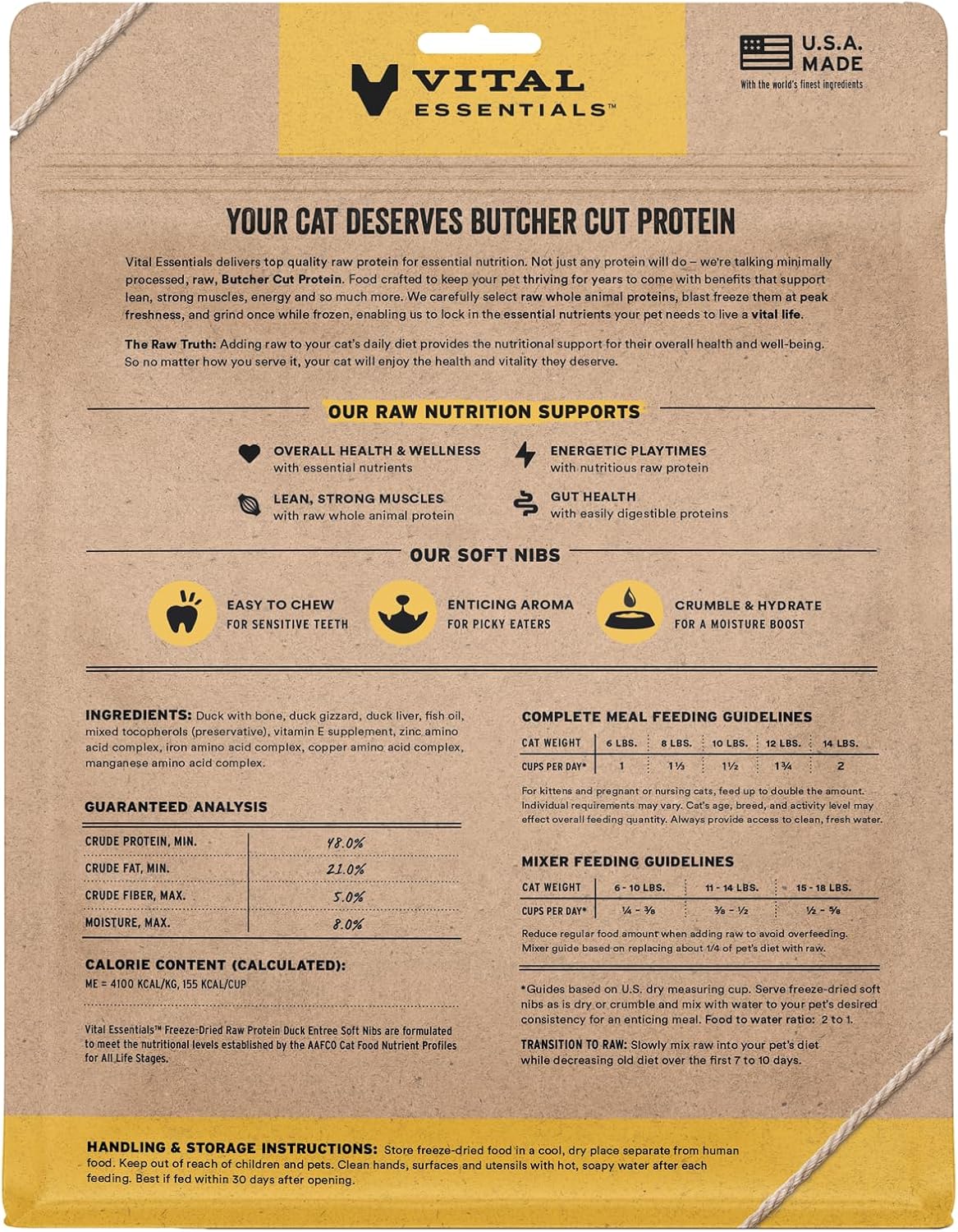 - SOFT NIBS FREEZE-DRIED RAW DUCK CAT FOOD: Vital Essentials Freeze Dried Cat Food packs more protein than industry standard into every soft bite to deliver the peak vitality your cat deserves, especially when compared to dehydrated cat food. Our complete and balanced freeze-dried raw cat food is made with Butcher Cut premium duck, responsibly sourced in the European Union.