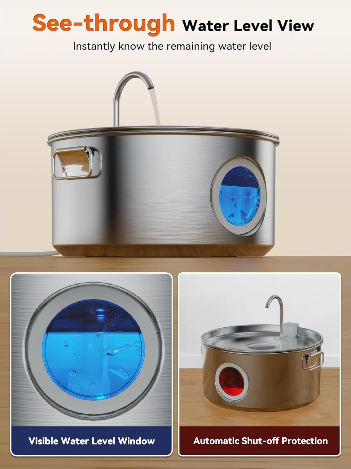 - Ideal Material for Longevity and Safety: This large dog water fountain is made of 304 food-grade stainless steel, ensuring your furry companion with a reliable source of hydration. The robust construction makes it resistant to damage from dents or chewing, fulfilling a long-term solution for your pet's hydration needs.