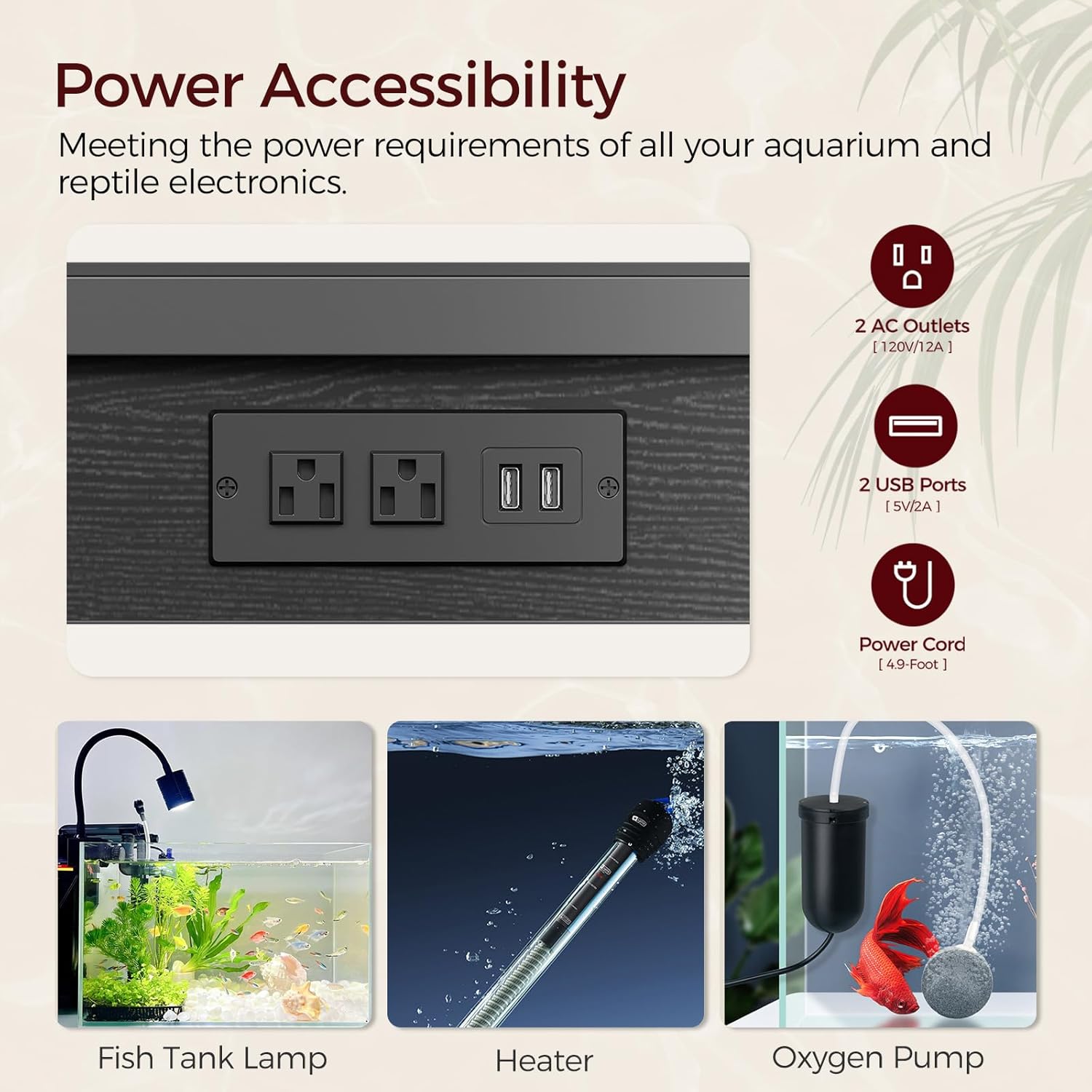 - Easy Power Solution: The fish tank stand, designed for 40-50 gallon tanks, includes 2 AC outlets and 2 USB ports, making it perfect for powering aquarium electronics such as lights and filters. Simplify aquarium maintenance with a handy socket