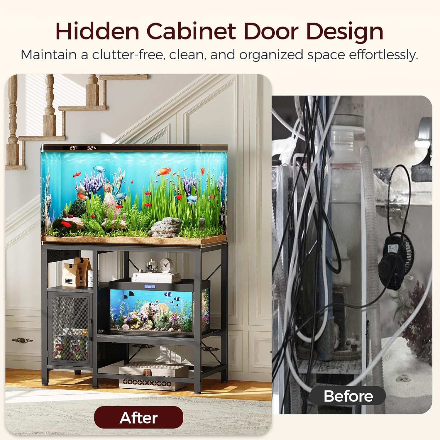 - Ample Storage: The fish tank stand with storage cabinets and shelves provides the right space for filters, tubing, fish food, etc., while the open shelves are functional for displaying accessories. Keep your aquarium area tidy and functional with everything at your fingertip