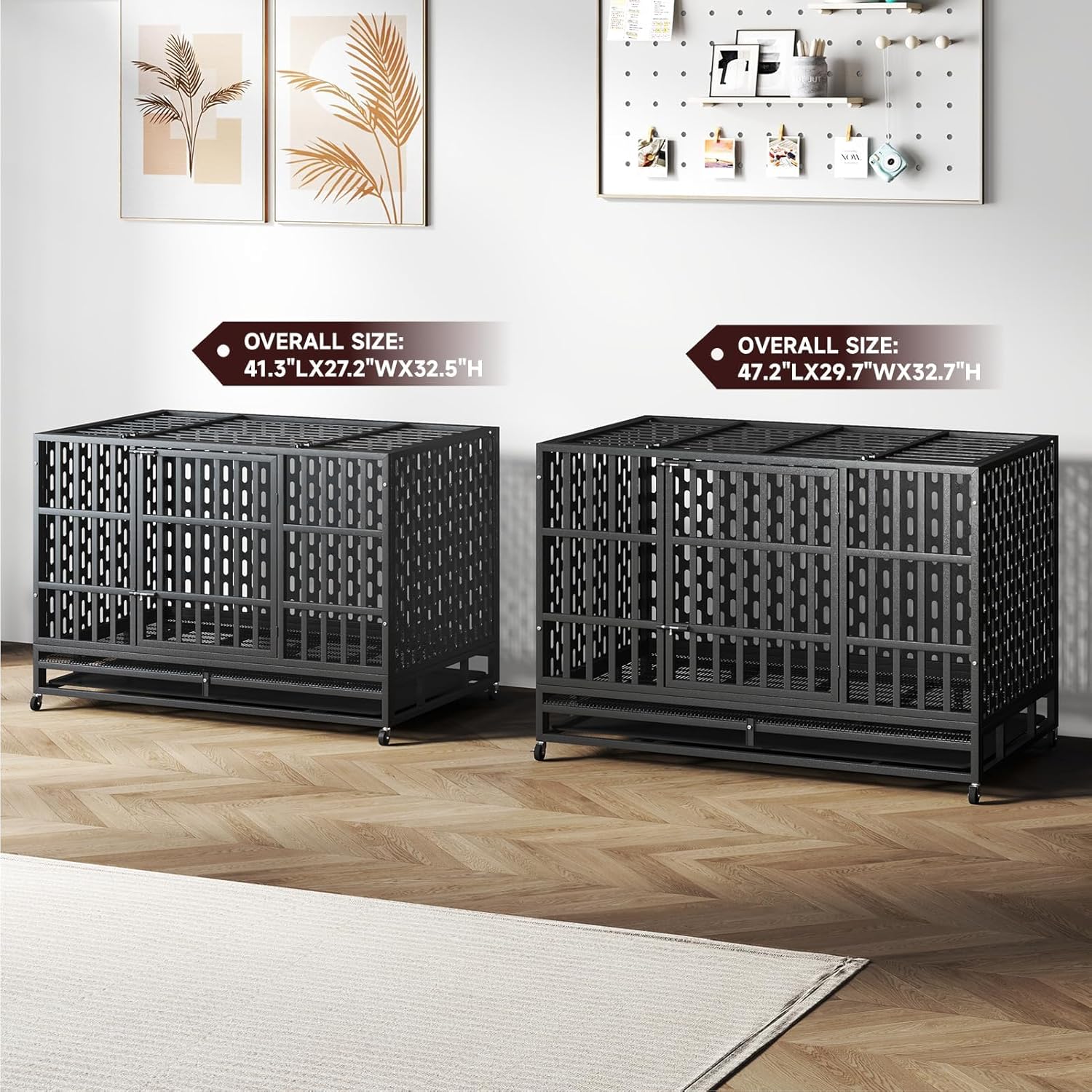 48/42 Inch Heavy Duty Indestructible Dog Crate Steel Escape Proof, Indoor Double Door High Anxiety Cage, Kennel with Wheels, Removable Tray, Extra Large XL XXL