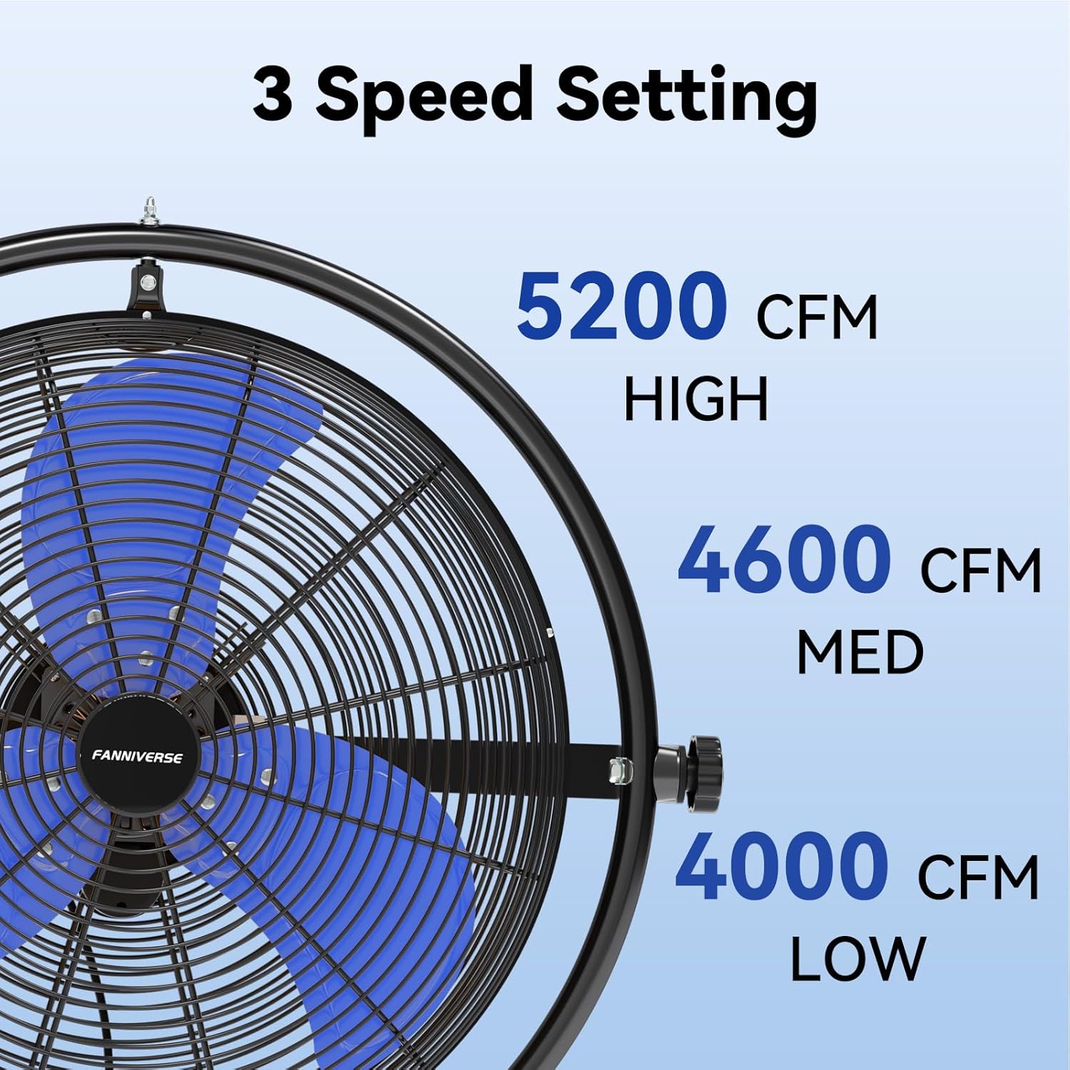 - Powerful Airflow & Wide Coverage: Fanniverse 20" wall-mounted oscillating fan delivers up to 5200 CFM of airflow with a reach of 40 ft. Features 80Β° oscillation and 300Β° vertical tilt for wide-area coverageβideal for indoors, garages, patios, workshops, and warehouses.