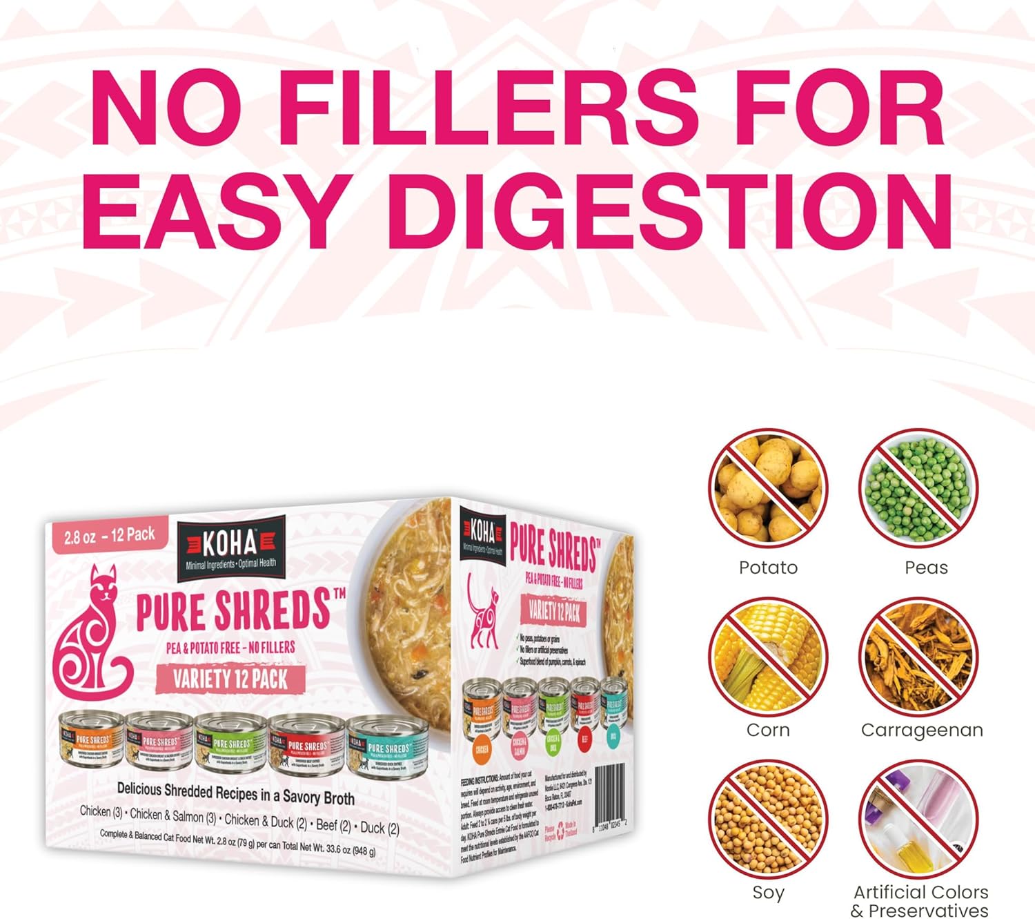 KOHA Pure Shreds Cat Variety Pack, High Protein Wet Cat Food - 5 Flavors - Beef, Duck, Chicken & Duck and Chicken & Salmon Food for Cats - 2.8 oz Cans, Pack of 12