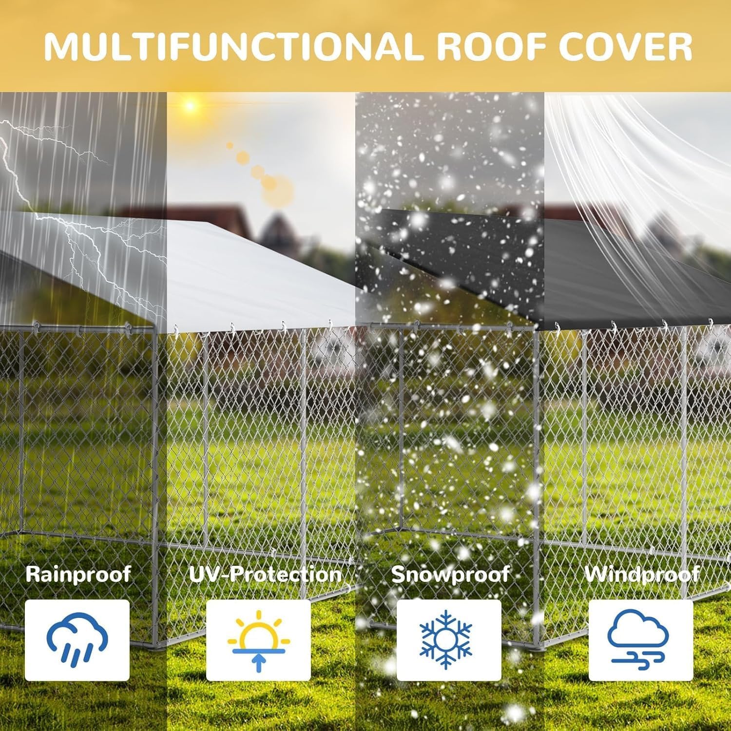 - Full Waterproof Cover:The waterproof cover can cover the entire top of the dog cage.On rainy days, even dogs in cages don't get wet.The plastic tie is used to connect with the fence,which can withstand strong winds