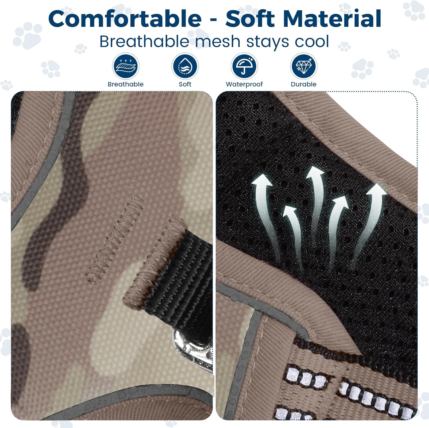 Funfox Dog Harness No Pull, Adjustable Pet Vest Harness, Super Soft Material with Vertical Handle Easy Control, Reflective Night Walking, 2 Leash Clips for Small Sized Dogs, Camo Brown, S