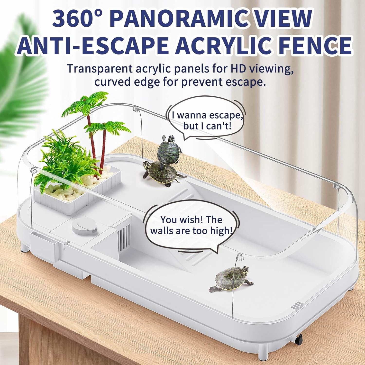 Large Turtle Tank with Water Pump, Acrylic Turtle Tank Starter Kit with Heightened and Curved Fences, Multi-Function Areas, Bottom Drainage