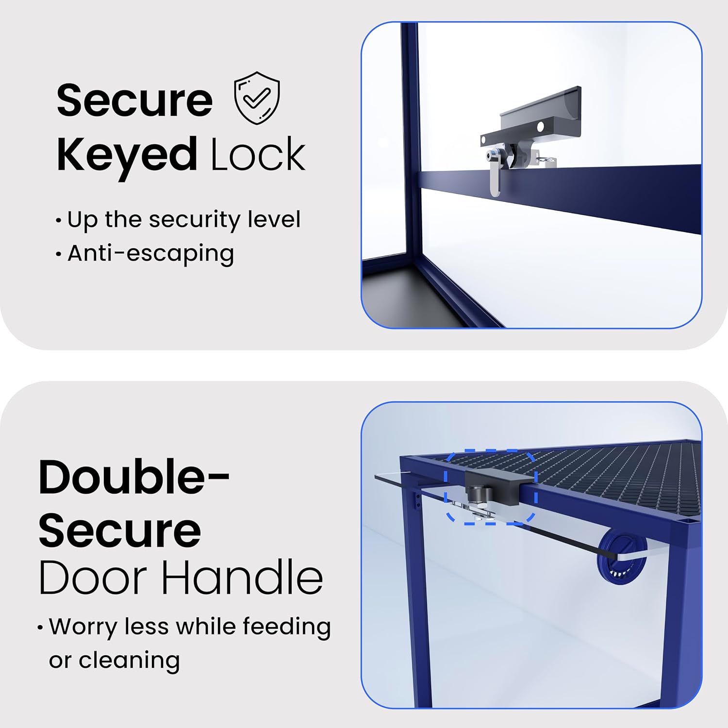 - γLock IncludedγA tempered glass door with a safety keyed lock to prevent escape and accidental opening by others. NO GAPS FOR ESCAPING with fully closed structure. Rigid tempered glass doors for extra safety.