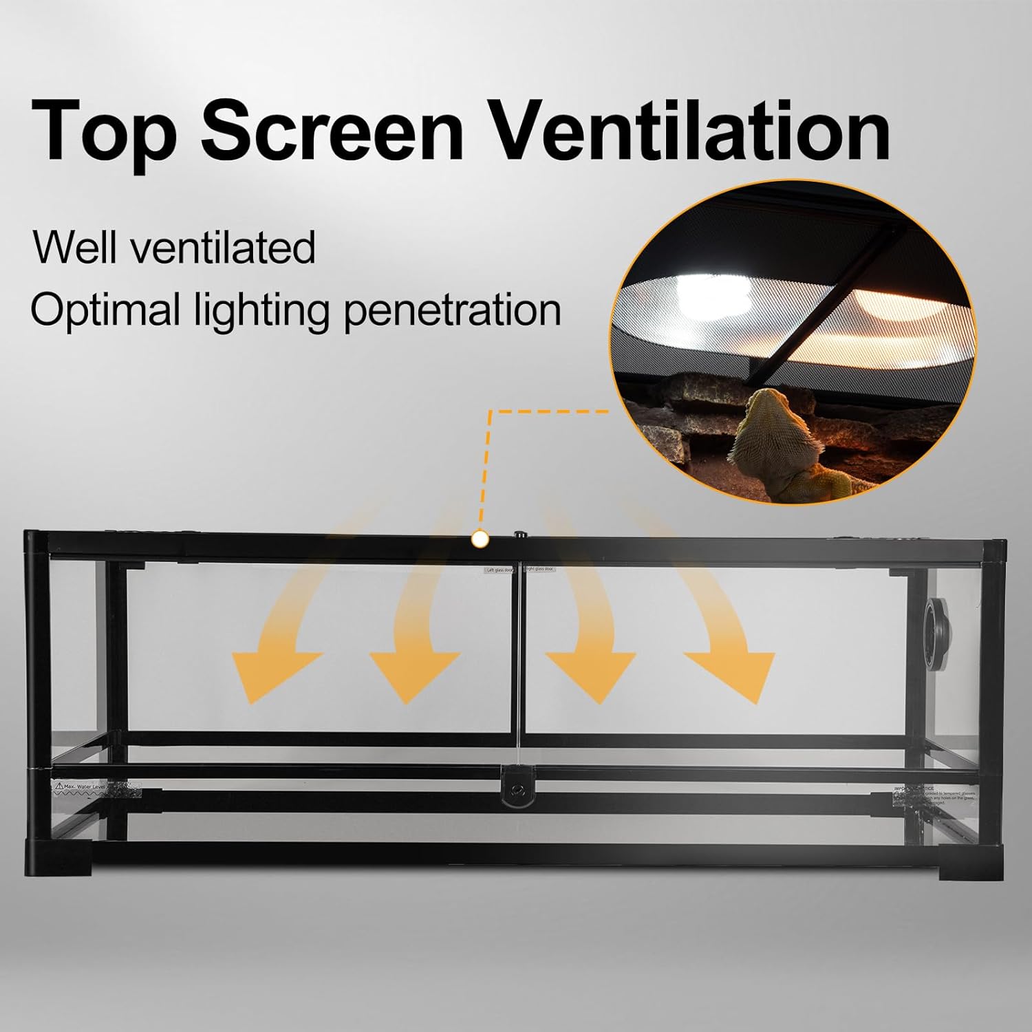 - Premium & Durable Construction: Featuring tempered glass on all four sides and aluminum alloy frame, iron mesh top, this terrarium delivers exceptional durability. Provides crystal-clear, uninterrupted viewing from every angle β an essential component for reptile habitat