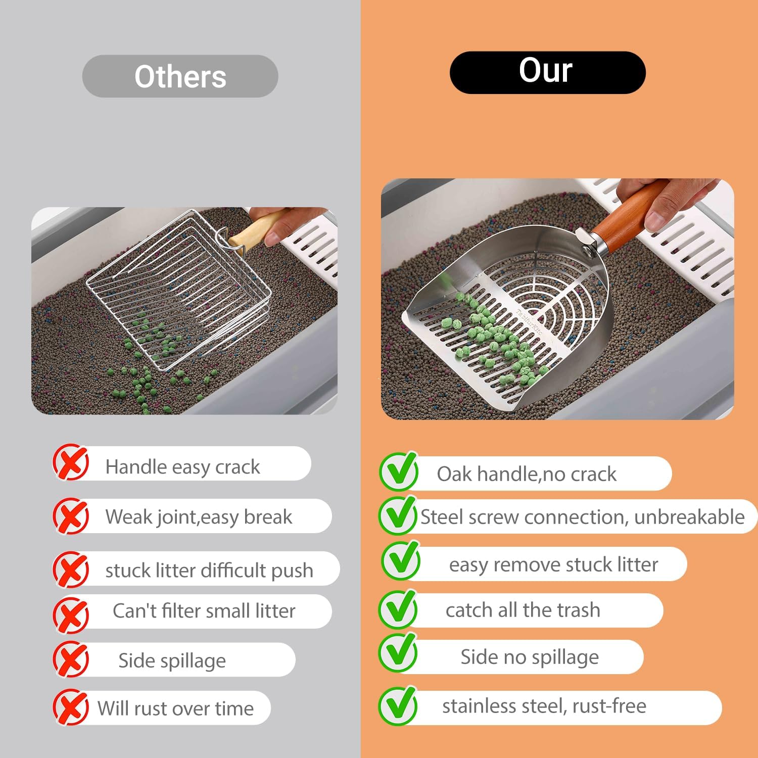 - [Long Oak Handle β Comfortable and Reliable Grip] The oak handle has been extended from 12.5cm to 15.5cm for improved comfort and reach. Itβs securely fastened with metal screws to ensure long-term stability. This long handle cat litter scoop wonβt loosen or breakβideal for daily use. Say goodbye to flimsy cat scooper handles that fail when you need them most.