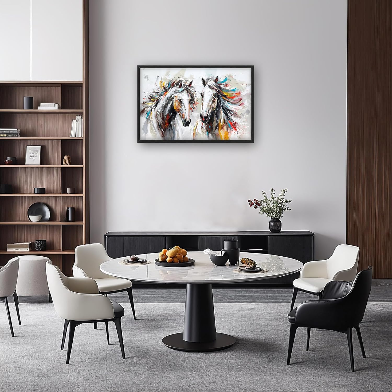 - 【Unique Design】Two horses with flowing manes, white background, colorful oil painting style, large brushstrokes, strong contrast between light and dark, fast running posture, bright colors, high saturation, strong sense of dynamism, elegant lines, gorgeous atmosphere.