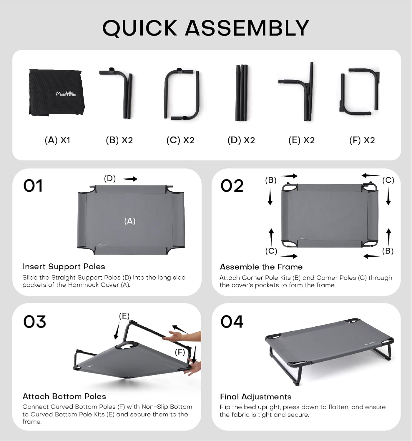 - Tool-Free, Hassle-Free Setup - No screws or tools neededβjust slide and click. The plug-in design allows for fast, frustration-free assembly. Whether you're at home or packing for a trip, this easy-to-assemble elevated dog bed sets up in minutes