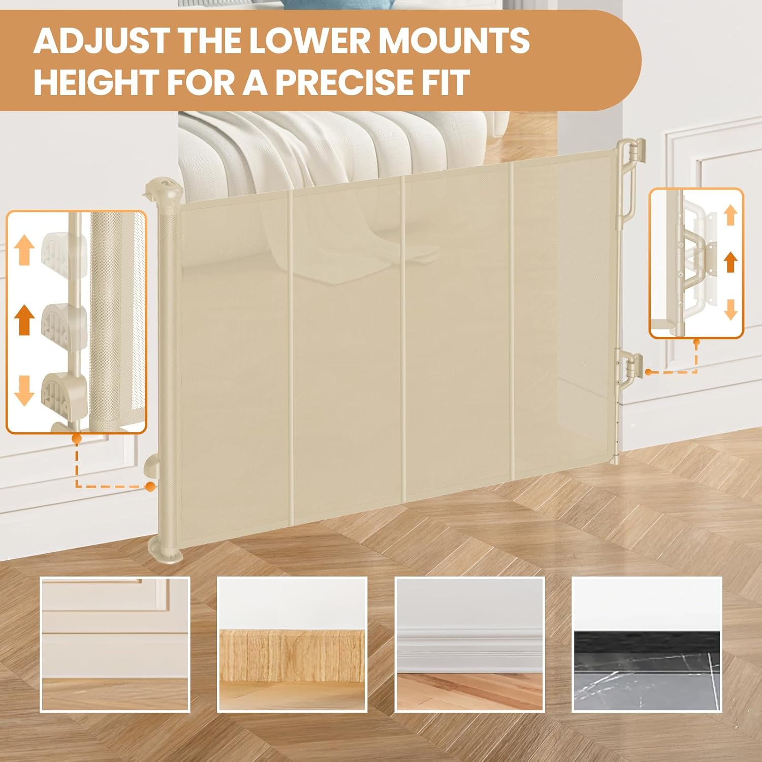 - 【Reinforced Safety Upgrade】 <1>The upgraded reinforced Retractable Baby Gates has three reinforced rods. Stronger and less prone to deformation. Prevent the top grid from sagging, deforming, and the bottom from lifting. Prevent babies and pets from crawling under gates. <2>Retractable baby gate featured with double locking mechanism creates a safety home for your curious crawlers and keep them away from danger, providing a safe, closed off environment to play.