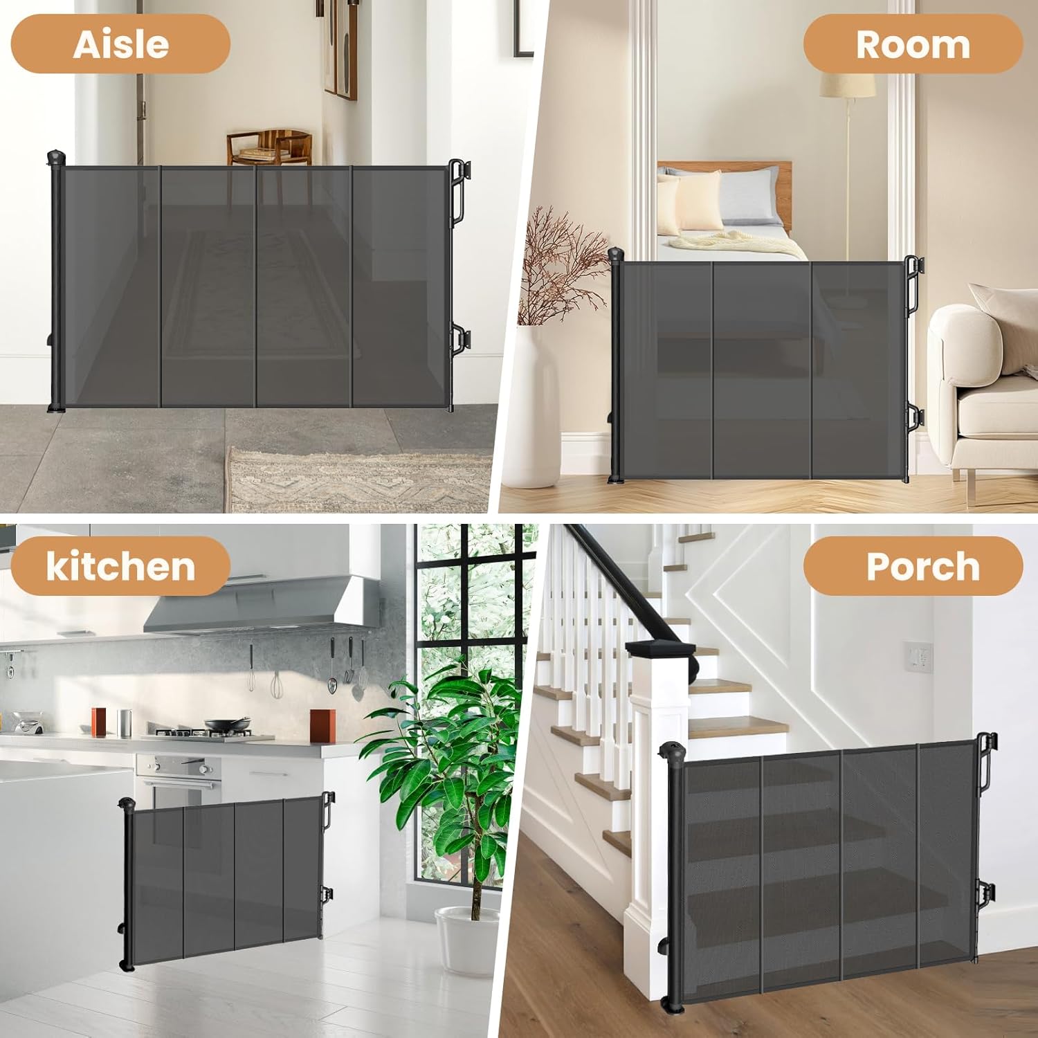 - 【Fits Your Purpose Perfectly】- The retractable baby gate is a perfect solution for providing safety and secruity space for children and pets. It is used for children and pets blocking off their way out or in. It's suitable for the kitchen, bedroom, living room, stairs, and other off-limit areas inside your home, providing a safe area for your little one. For use in both indoor and outdoor spaces.