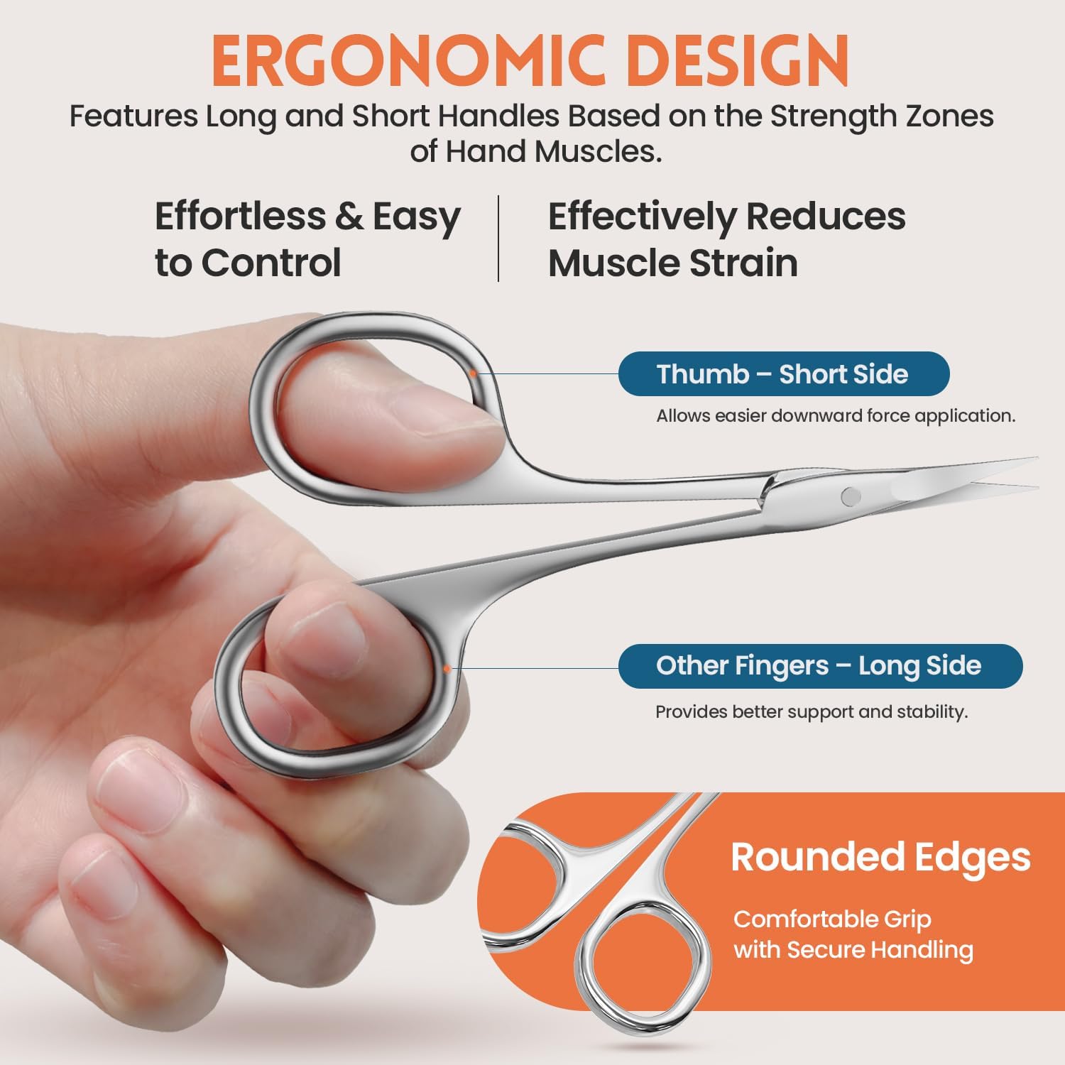 - Medical-Grade Precision Curved Nail Scissors: Features an ultra-fine 0.1cm tip for surgical-level precision. The curved blade contours naturally to the skin, allowing safe and accurate trimming without the risk of nicks
